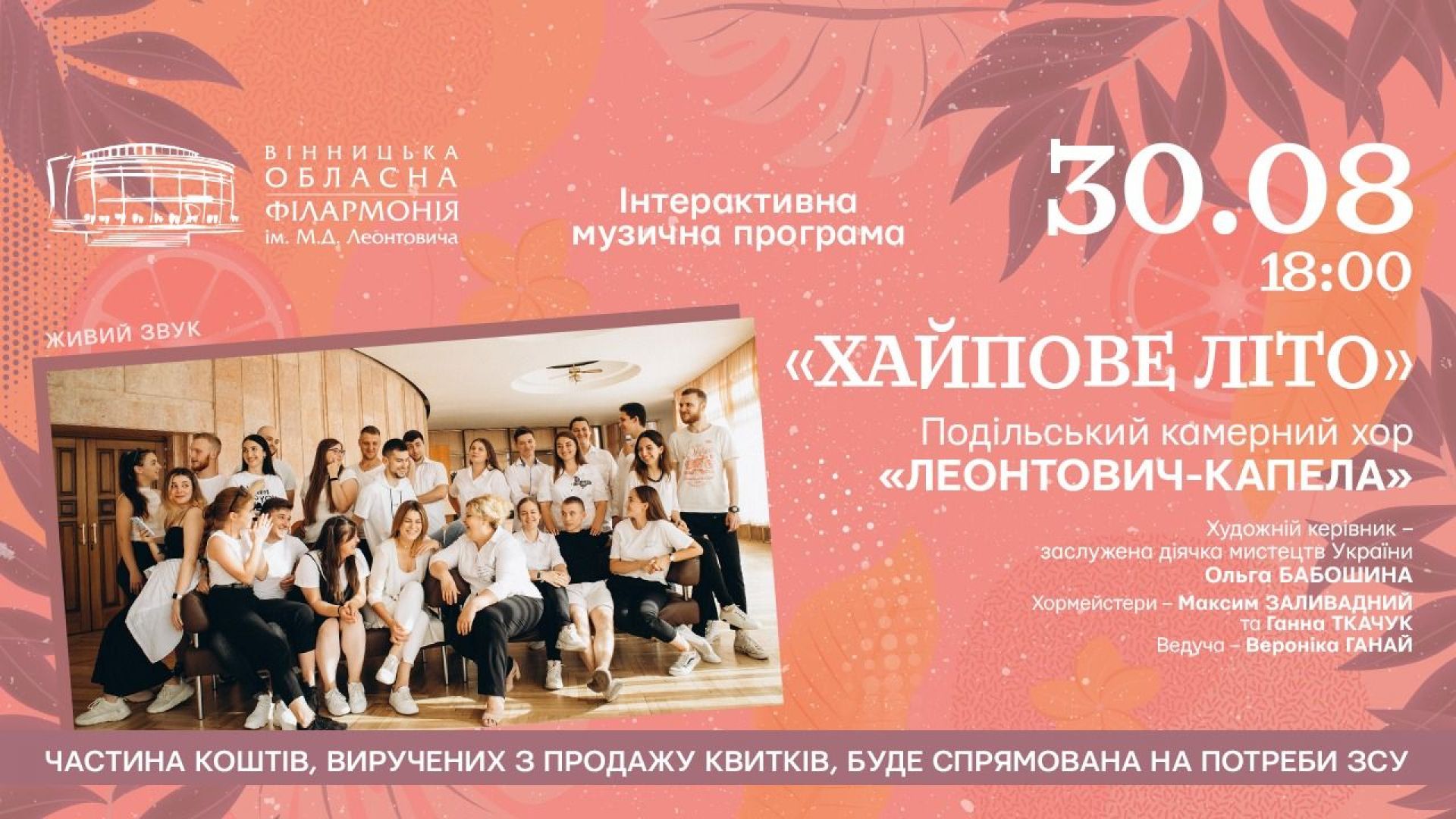 - Крім того, вперше пройде неординарна інтерактивна музична програма «Хайпове літо» Подільського камерного хору «Леонтович-капела», під час якого глядачі навіть зможуть взяти безпосередню участь у концертних номерах!