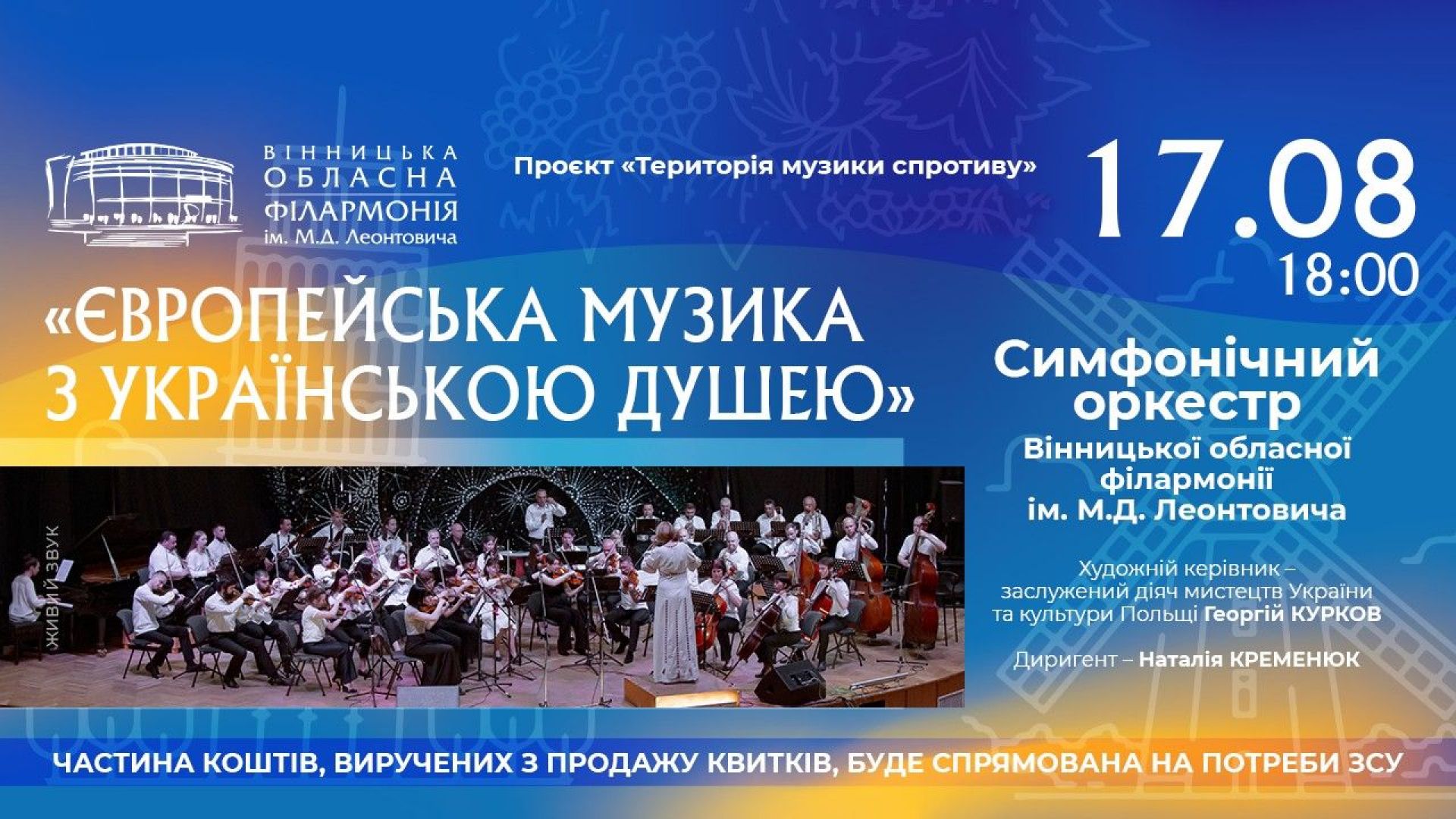17 серпня о 18.00 Симфонічний оркестр та солісти філармонії вразять великим концертом «Європейська музика з українською душею», що стане черговим символом єднання України з державами, які самовіддано нас підтримують у час війни.