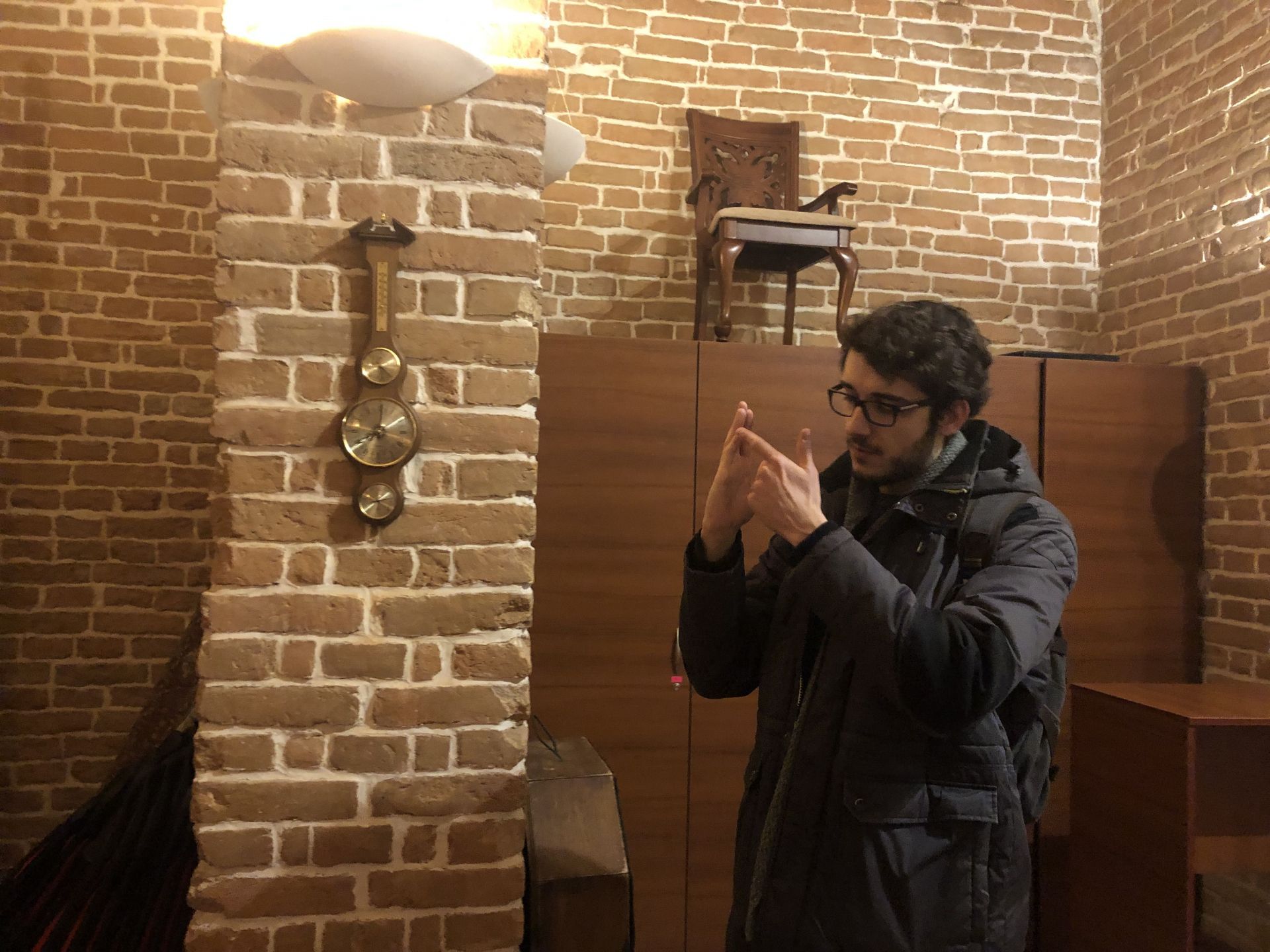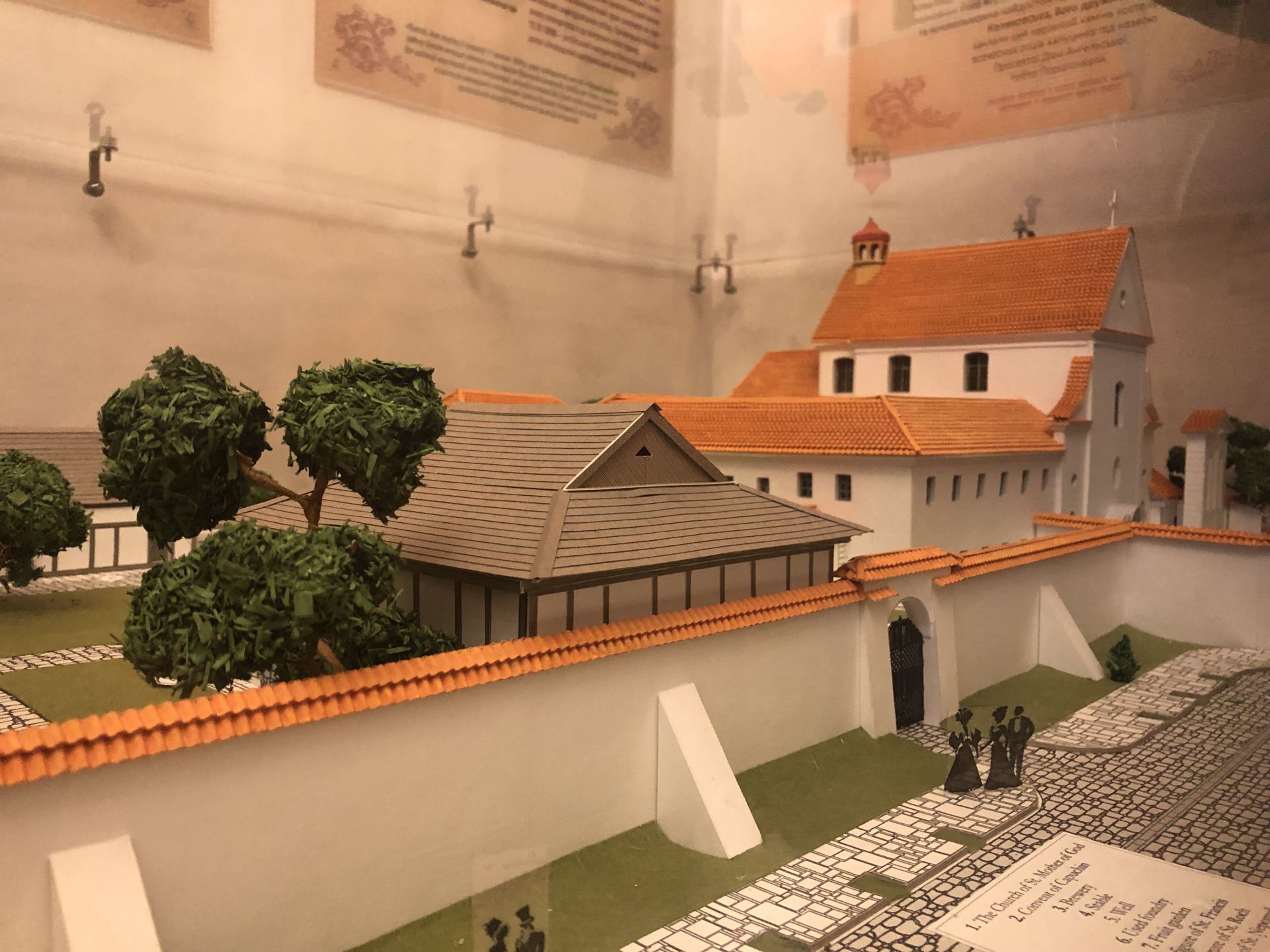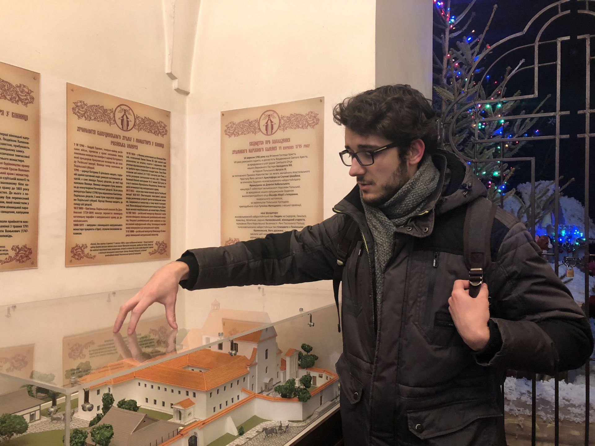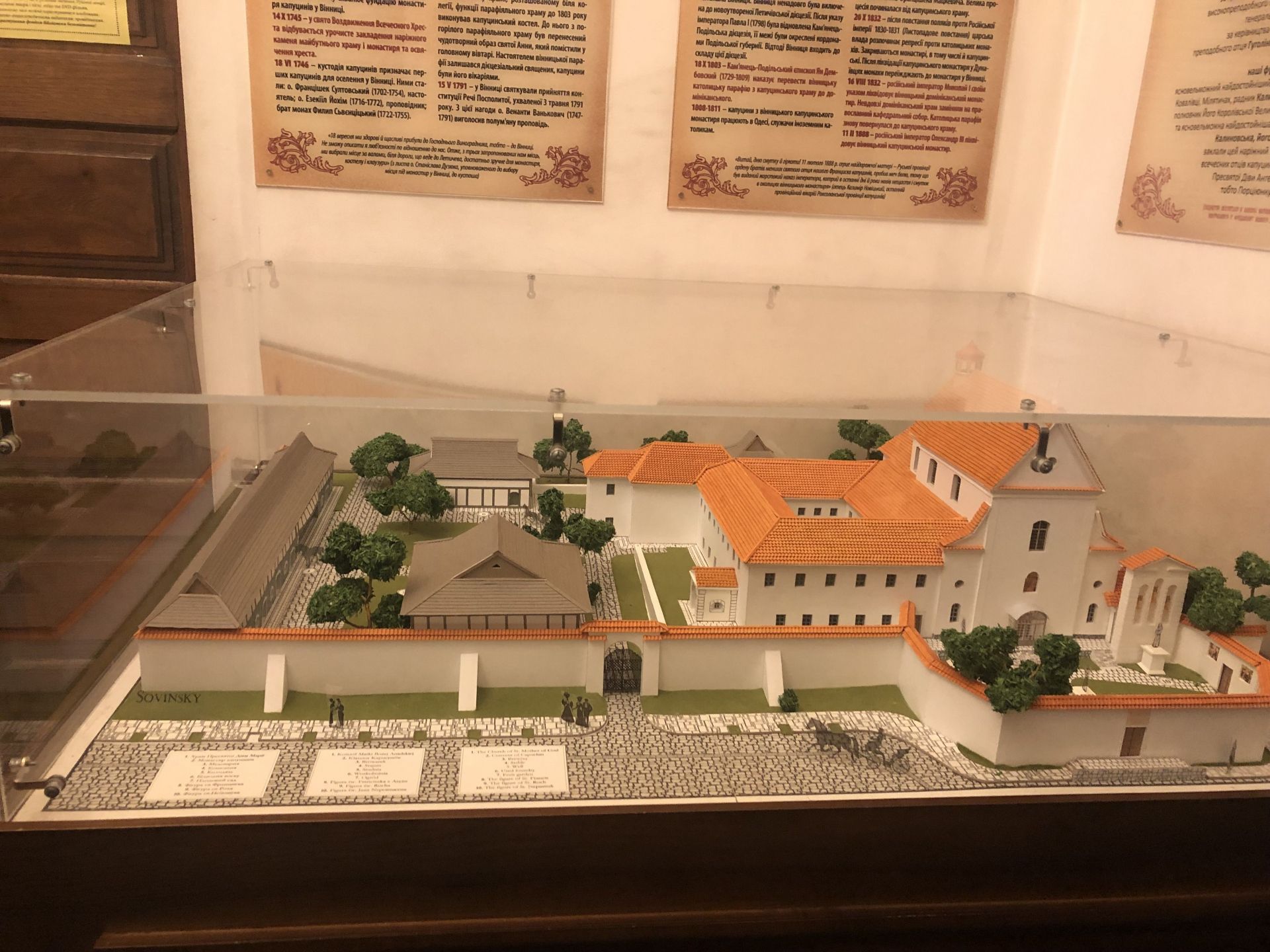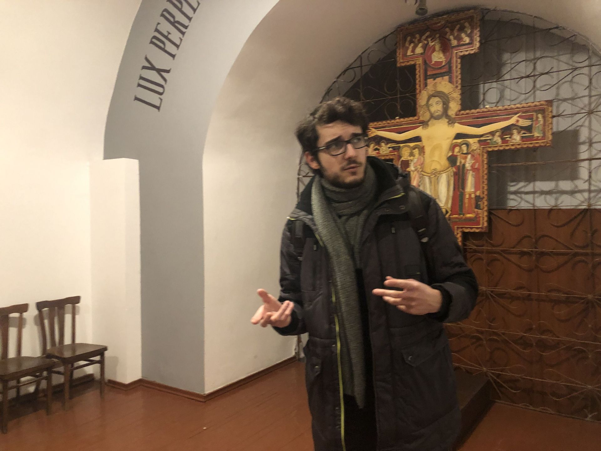 Ми чекаємо на іншого екскурсовода, який спеціалізується саме на монастирі та катакомбах під ним – це Олег Панішкевич. Хлопець одразу веде до макету монастиря, який розташований біля входу. Тут мова йде про загальну будову. Звертаємо увагу і на архітектуру будівлі: ребристі стелі – нервюри. Стиль аскетичного бароко, який був притаманний виключно капуцинам 16 століття. Саме він підкреслював бідність церкви і людей, які до неї приходили.