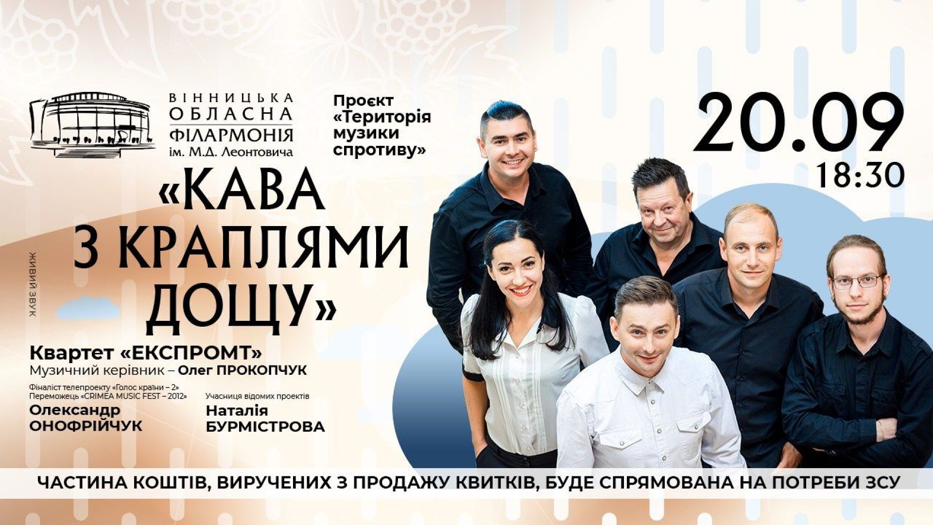 «Love of my life», «Залишені квіти», «Намалюй мені ніч», «Can't take my eyes off of you», «Відлуння твоїх кроків» та іншими неймовірно ароматними композиціями, що не залишать байдужим нікого, будемо насолоджуватися 20 вересня о 18.30 на концерті «Кава з краплями дощу». Саме так свою нову дивовижну програму назвав квартет «Експромт» і його незмінні голоси: Олександр Онофрійчук та Наталія Бурмістрова.