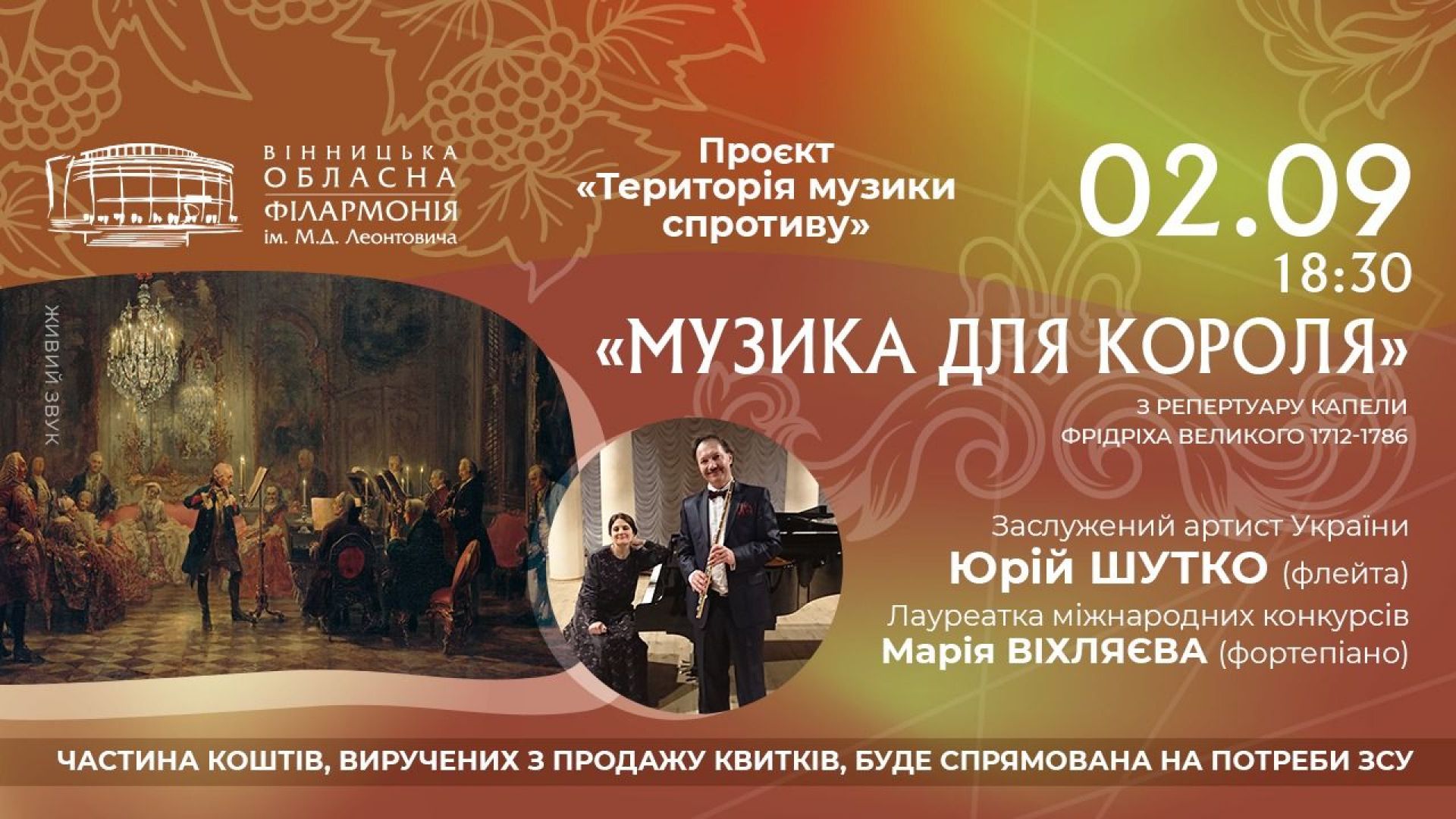 У п’ятницю, 2 вересня, о 18.30 столичні гості — знаменитий флейтист, заслужений артист України Юрій Шутко та віртуозна піаністка, лауреатка міжнародних конкурсів Марія Віхляєва презентують захоплюючий концерт «Музика для короля». Вінничани почують твори із репертуару капели Фрідріха Великого — одного із найвизначніших правителів Німеччини за всю історію.