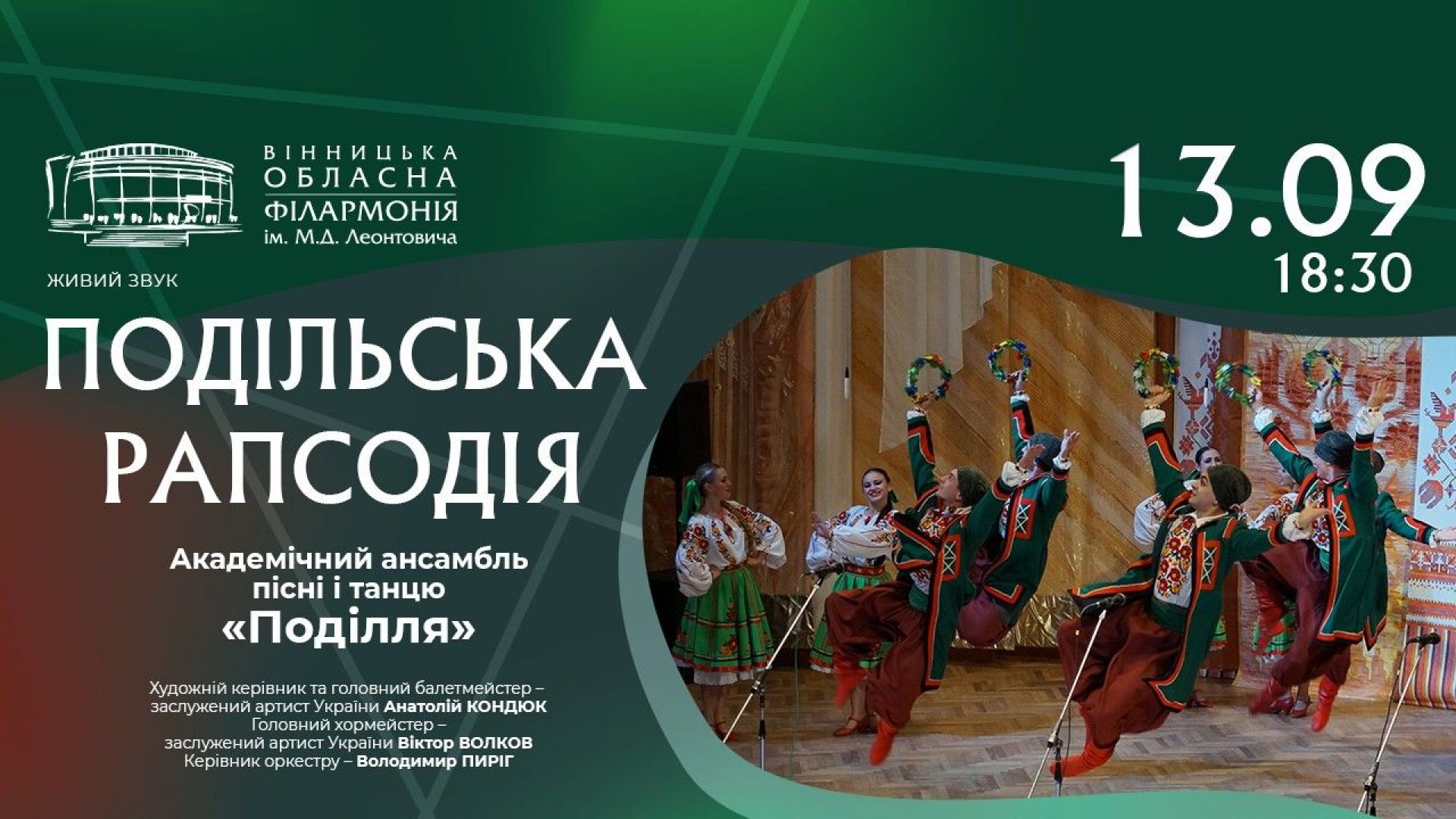Масштабний фолькперформанс, що проходитиме у форматі нон-стоп дійства, чекає вінничан та всіх гостей міста 13 вересня о 18.30. Славетний Академічний ансамбль пісні і танцю «Поділля» презентує оновлену програму «Подільська рапсодія», до якої увійшли як хрестоматійні, так і нові твори та постановки — хорові обробки народних пісень, хореографічні композиції та віртуозні інструментальні п'єси.