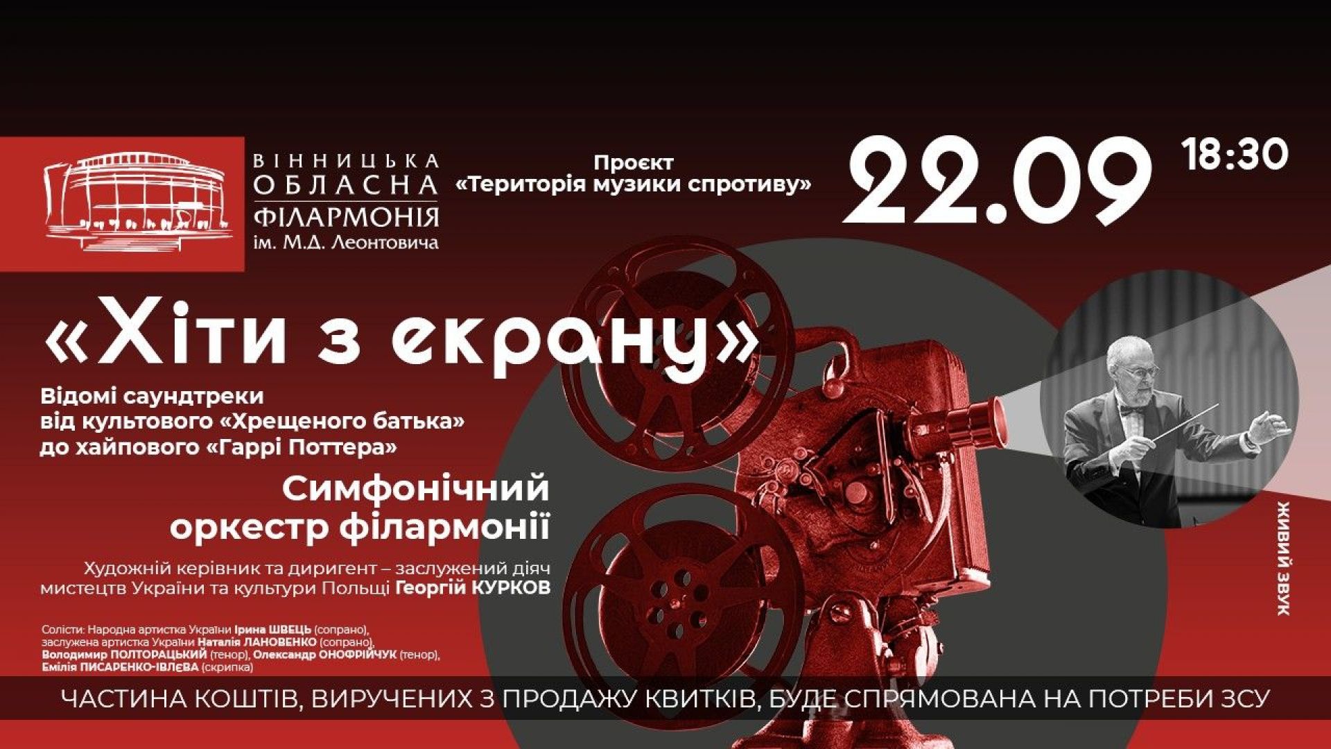 Легендарні композиції із культових фільмів «Зоряні війни», «Список Шиндлера», «Тегеран-43», «Вогнем і мечем» та багатьох інших оживуть завдяки винятковій грі Симфонічного оркестру Вінницької обласної філармонії (художній керівник та диригент — заслужений діяч мистецтв України та культури Польщі Георгій Курков).