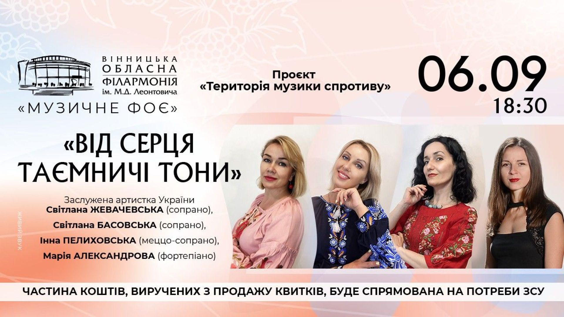 Героїнями співочого «дівичвечора» стануть: улюблене сопрано Віталія Газінського, заслужена артистка України Світлана Жевачевська, солістка Вінницького театру ім. Садовського, найкраща Наталка Полтавка міста і витівниця Адель (у опереті «Летюча миша») Світлана Басовська, солістка Вінницького академічного камерного хору ім. В. Газінського, меццо-сопрано з насичено-яскравим тембром, генераторка творчих ідей та авторка проєкту Інна Пелиховська, а також піаністка з музичної родини, чудова концертмейстерка, яка завжди готова до співпраці, Марія Александрова.