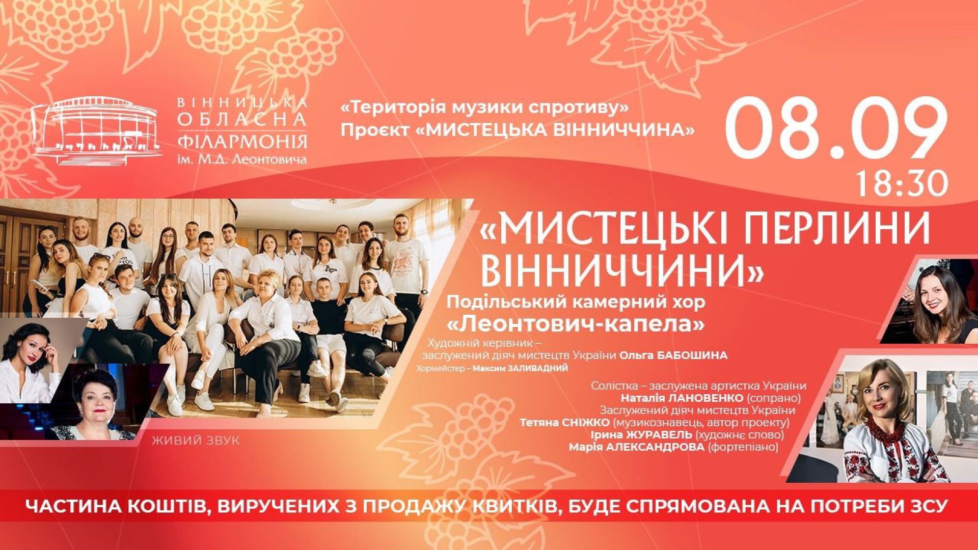 Неймовірні хорові твори від Скалецького до Леонтовича пролунають у виконанні Подільського камерного хору «Леонтович-капела», який на початку серпня вразив європейців на гастролях у Молдові та Румунії, ставши окрасою грандіозного міжнародного проєкту за участю 110 артистів із 7 країн. Художня керівниця «Леонтович-капела» — заслужена діячка мистецтв України Ольга Бабошина, хормейстер — Максим Заливадний.