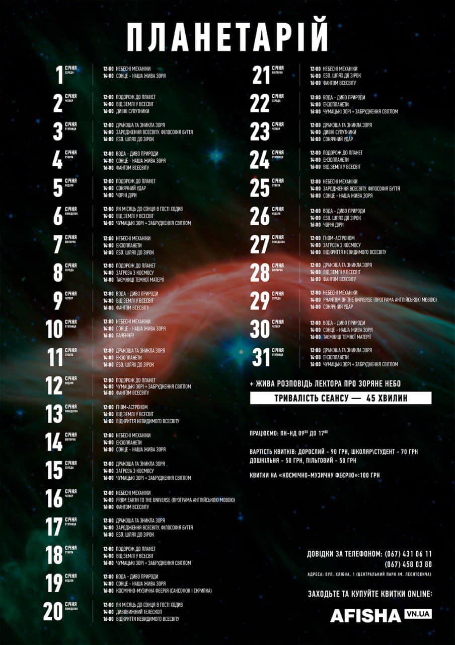 Окрім цього концерту, щодня у Вінницькому планетарії проходять покази захоплюючих шоу-програм для всієї родини: «Відкриття невидимого Всесвіту», «Подорож до планет», «Фантом Всесвіту», «Загроза з космосу», «Таємниці темної матерії», «Бачення», «Дивні супутники», «Сонячний удар», «ESO. Шлях до зірок», «Дракоша та зникла зоря», «Гном-астроном», «Як Місяць до Сонця в гості ходив», «Чумацькі зорі» та «Забруднення світлом», «Від Землі у Всесвіт», «Небесні механіки», «Сонце — наша жива зоря», «Дивовижний телескоп», «Чорні діри», «Екзопланети», «Зародження Всесвіту. Філософія буття», «Вода — диво природи» та ексклюзивна програма англійською мовою «From Earth to the Universe».