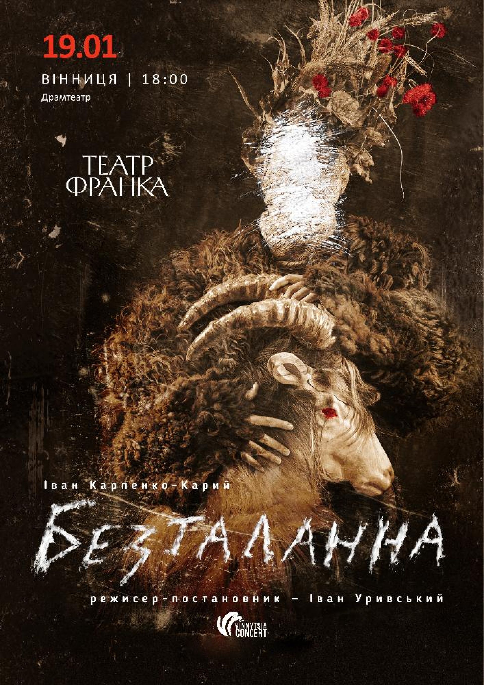 Головною театральною подією зими у Вінниці 19 січня о 18.00 на сцені театру ім. Садовського стане показ вражаючої вистави «Безталанна» від режисера «Конотопської відьми» Івана Уривського і славетного Національного театру ім. Івана Франка, на яку у Києві досі дуже непросто виловити квитки.