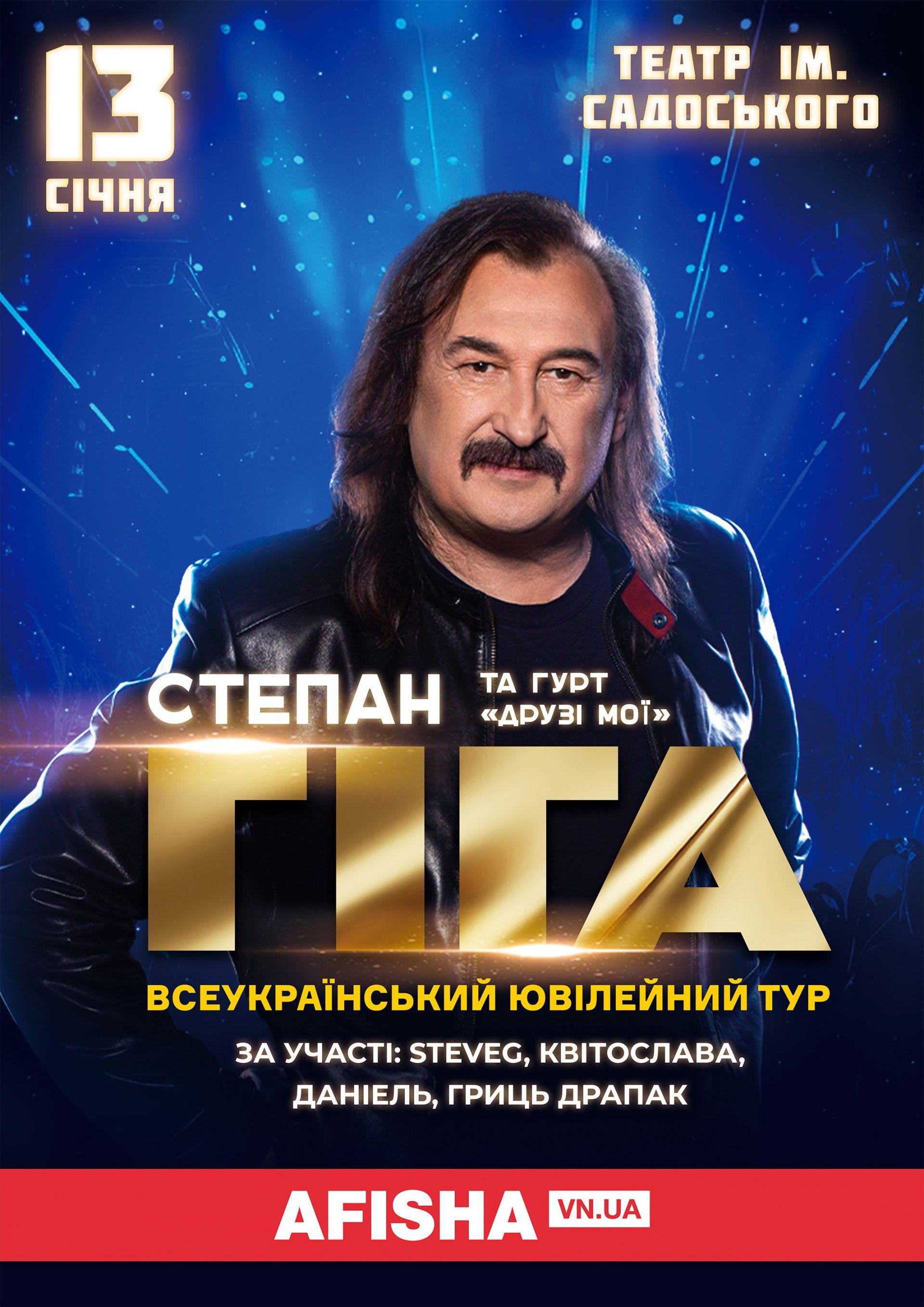 Незабутні понад дві години легендарних пісень, шаленої енергетики, щирих спогадів і найгучніших спільних співів чекають всіх 13 січня о 19.00 у театрі ім. Садовського на великому ювілейному концерті Степана Гіги у Вінниці.