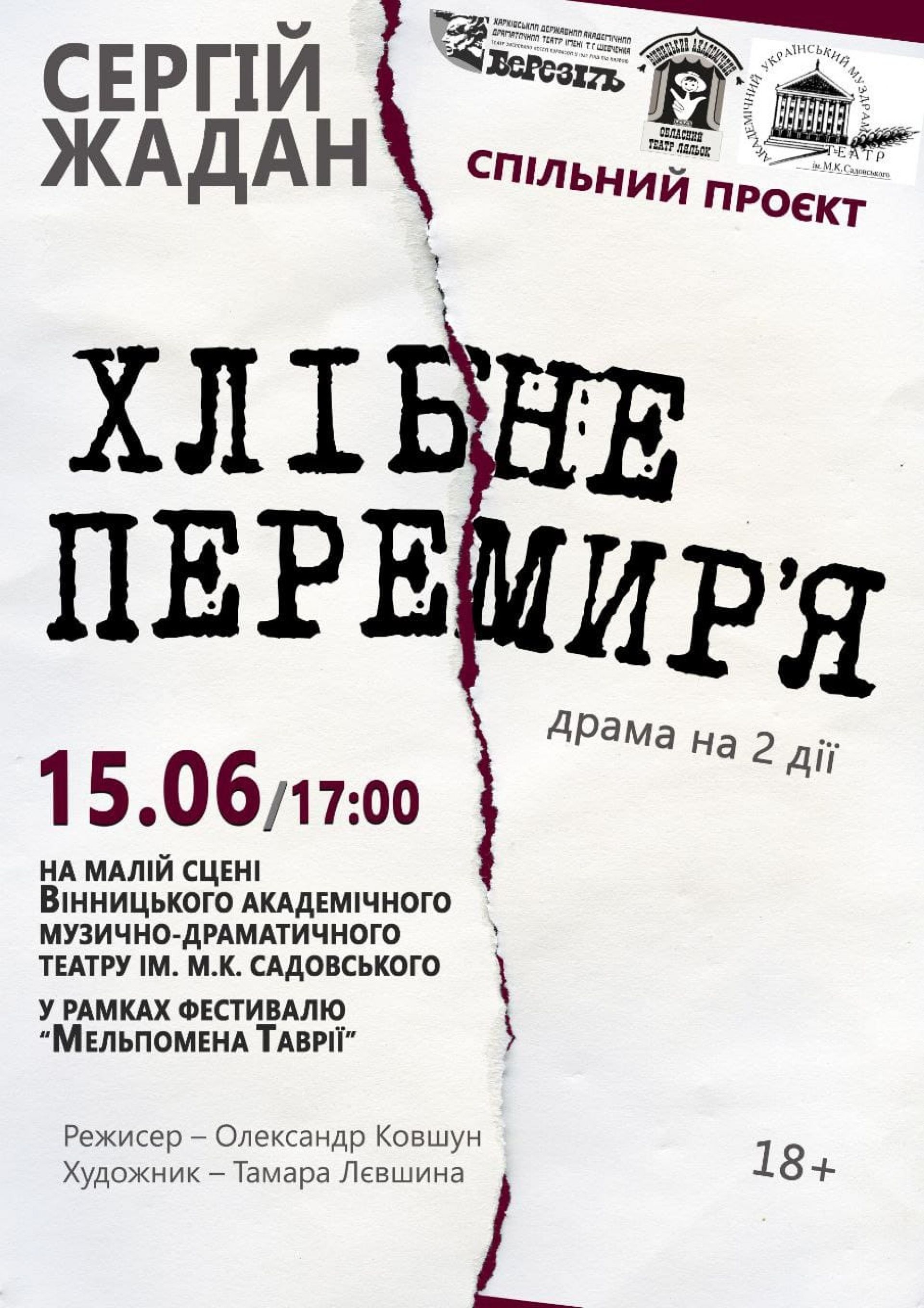 У мирний час дружні театри за традицією у червні зустрілися би на знаменитому міжнародному театральному фестивалі «Мельпомена Таврії» у Херсоні. Та після нападу рашистів Херсонщина опинилась у тимчасовій окупації, а частина трупи Харківського театру була вимушена переїхати у Вінницю. Саме тут березільці, садовці та вінницькі лялькарі й вирішили зробити спільну версію драми «Хлібне перемир’я» за однойменною п’єсою одного з найпопулярніших сучасних письменників України Сергія Жадана.
