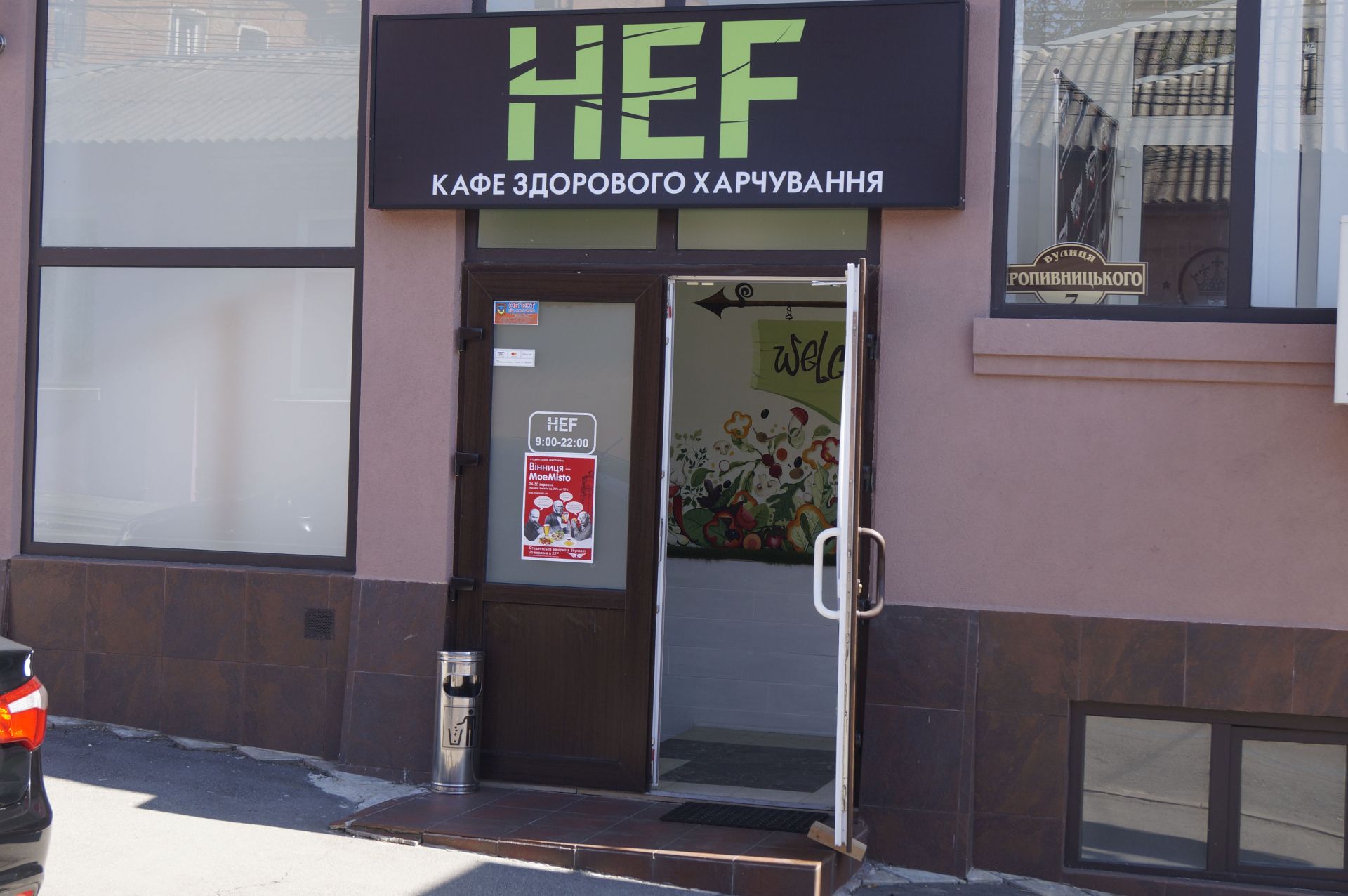 Кафе «HEF» розташоване за адресою Кропивницького 7А. Тут ще немає величезної вивіски, але щодня у закладі збирається повний зал відвідувачів. Кафе «виросло» з доставки здорового харчування, яке працює у Вінниці вже не один рік. Тому його добре знають спортсмени та фітнес тренери. А чемпіон України з бодібілдингу Адольфо Момбедо харчується тут чи не з першого дня.