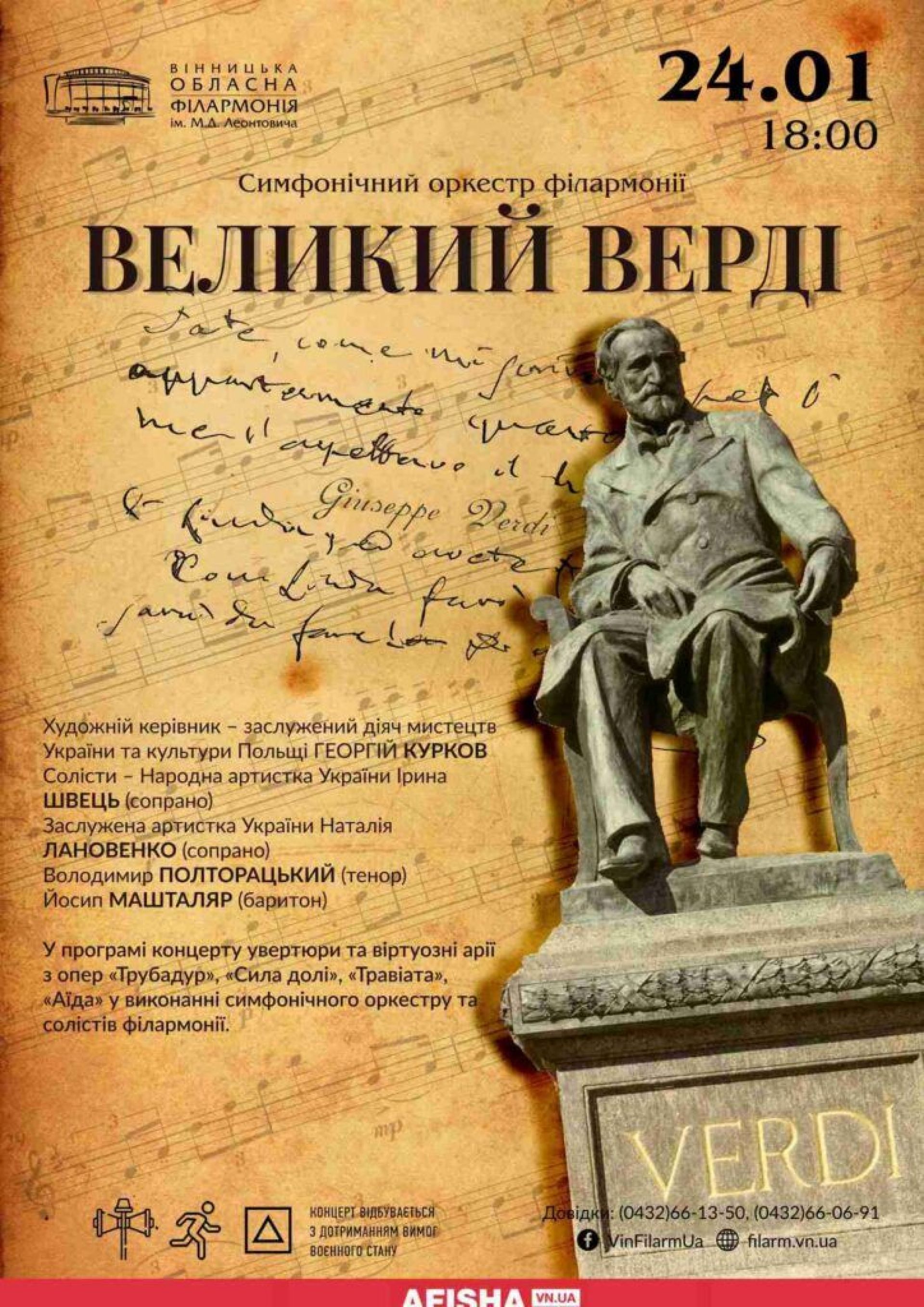 Симфонічний оркестр Вінницької філармонії 24 січня о 18.00 чекає всіх на концерті «Великий Верді», що стане незабутнім вечором безсмертних оперних шедеврів.