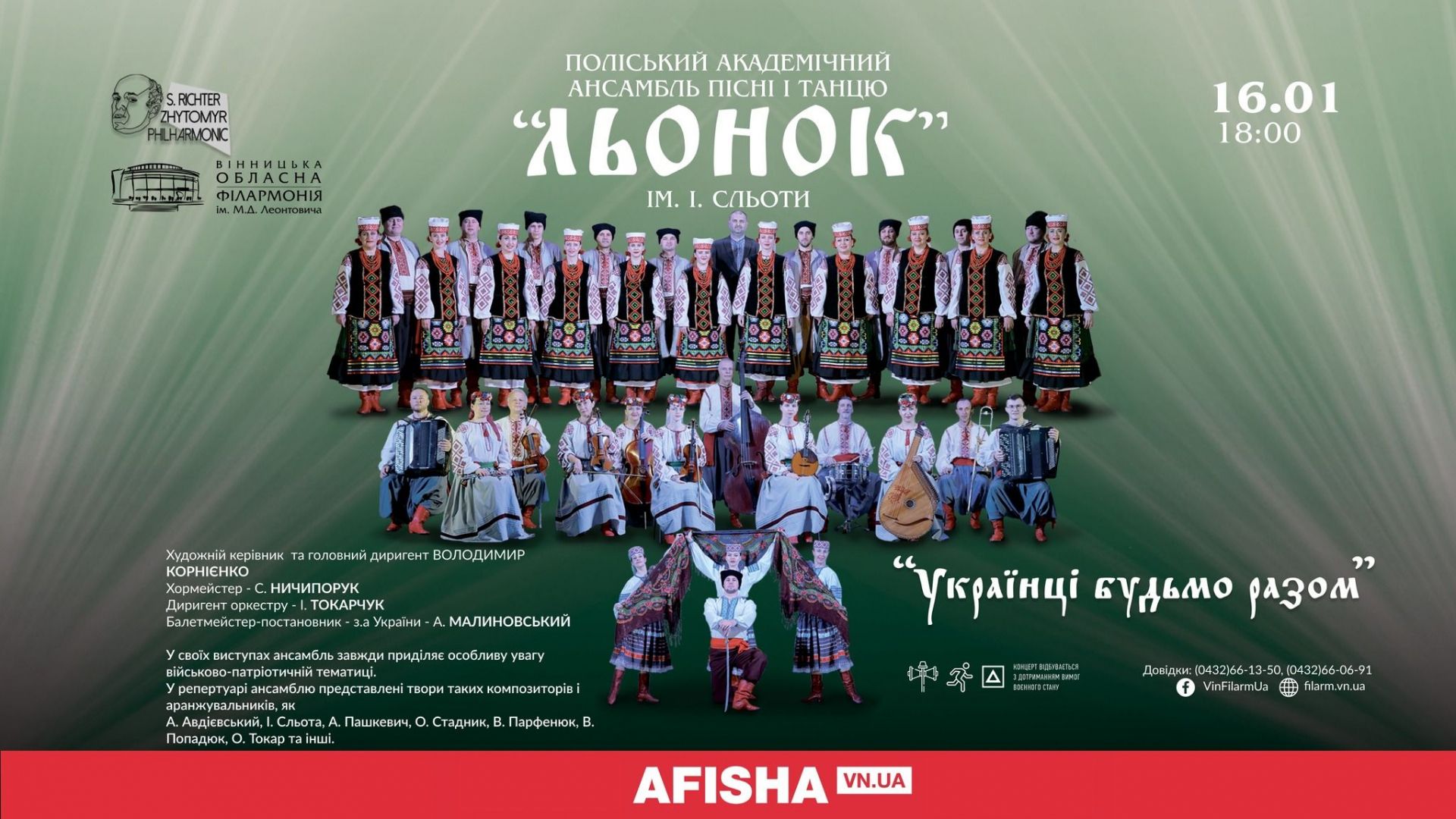 Феєрична подорож у світ Поліського краю, захват від краси українських традицій та насолода неповторними голосами, яскравими костюмами та хореографічними композиціями, у яких розкривається душа українського народу, чекають вінничан у вівторок, 16 січня, о 18.00 у Вінницькій філармонії на концерті «Українці будьмо разом!» славетного Поліського академічного ансамблю пісні і танцю «Льонок» імені Івана Сльоти.
