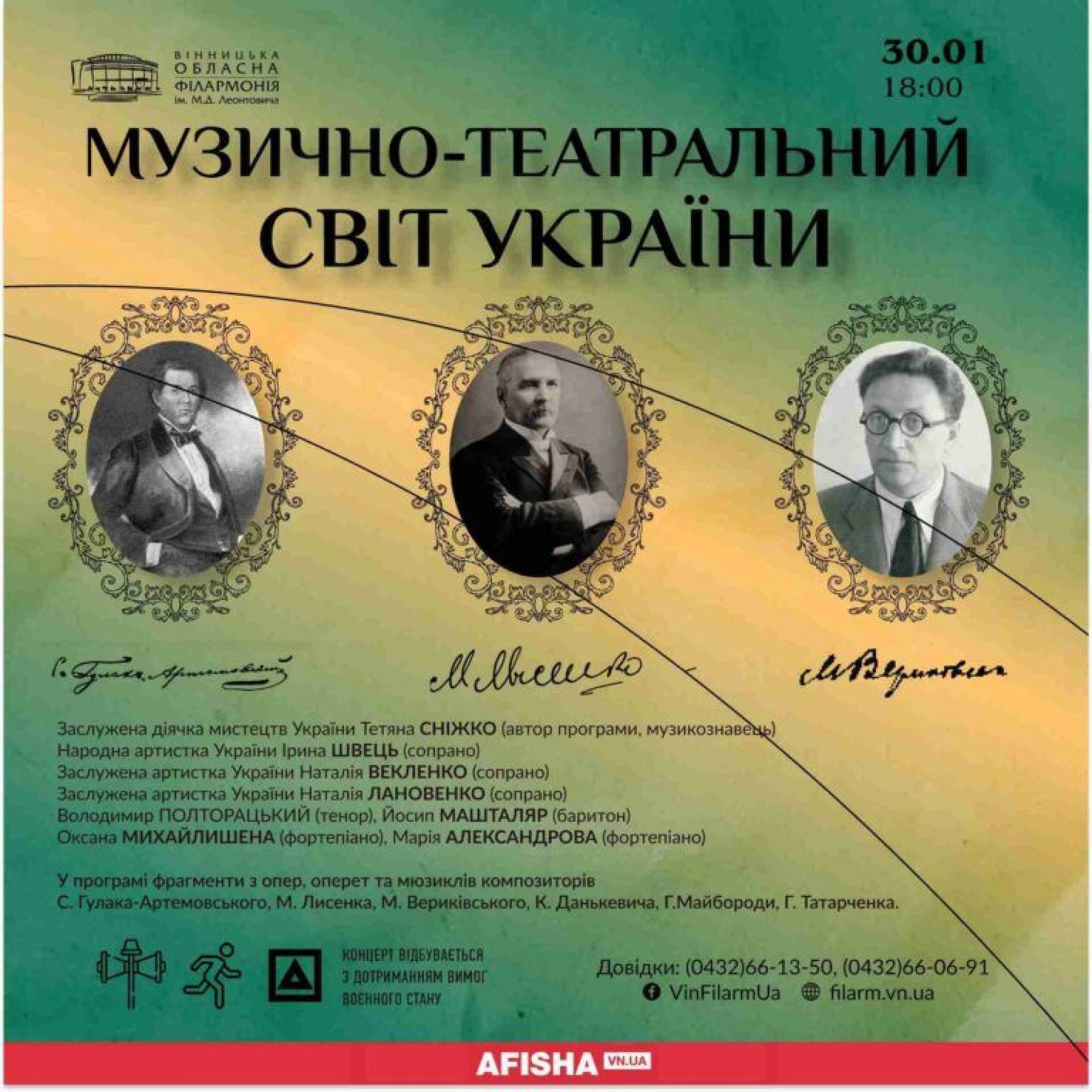 Під девізом: «Слухаємо українське!» — 30 січня о 18.00 у філармонії пройде концерт «Музично-театральний світ України». Глядачів зачарує дзвінкоголосий світ української опери, оперети та мюзиклу.