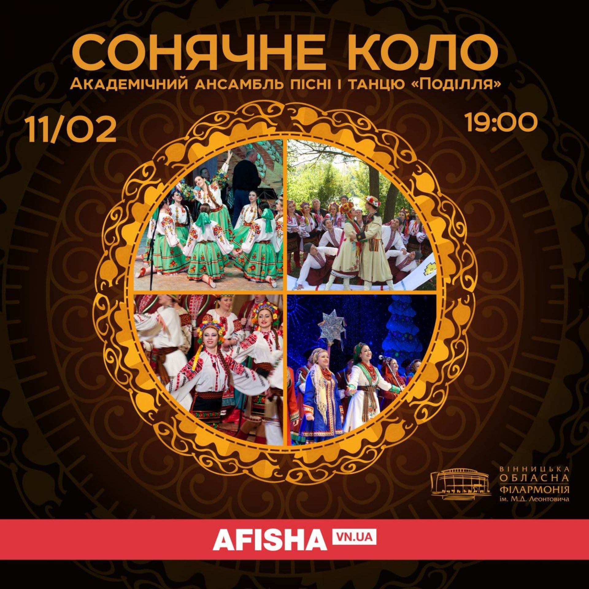 11 лютого о 19.00 у філармонії Академічний ансамбль пісні і танцю «Поділля» презентує яскраву пісенну, танцювальну і театралізовану програму «Сонячне коло».