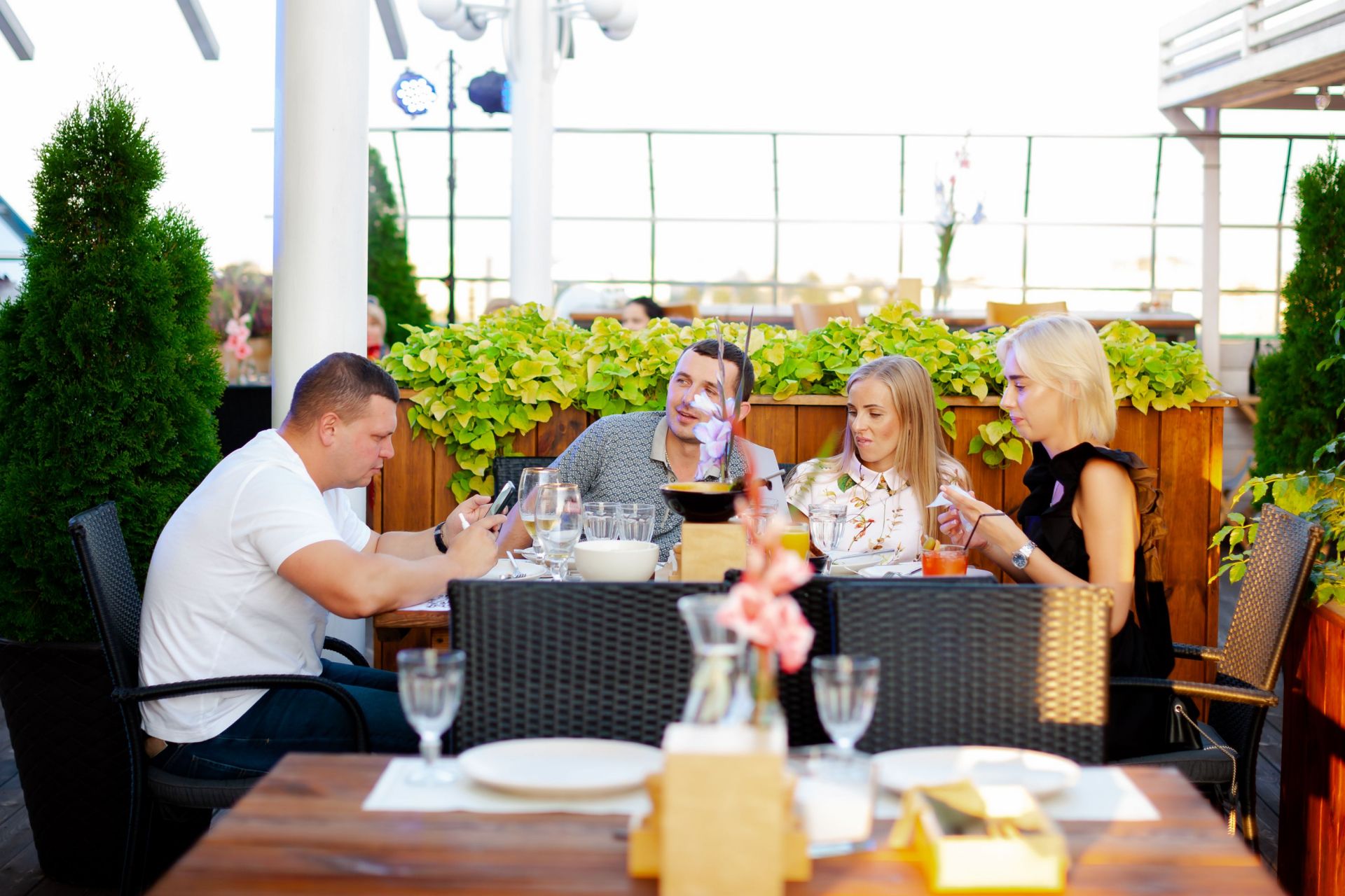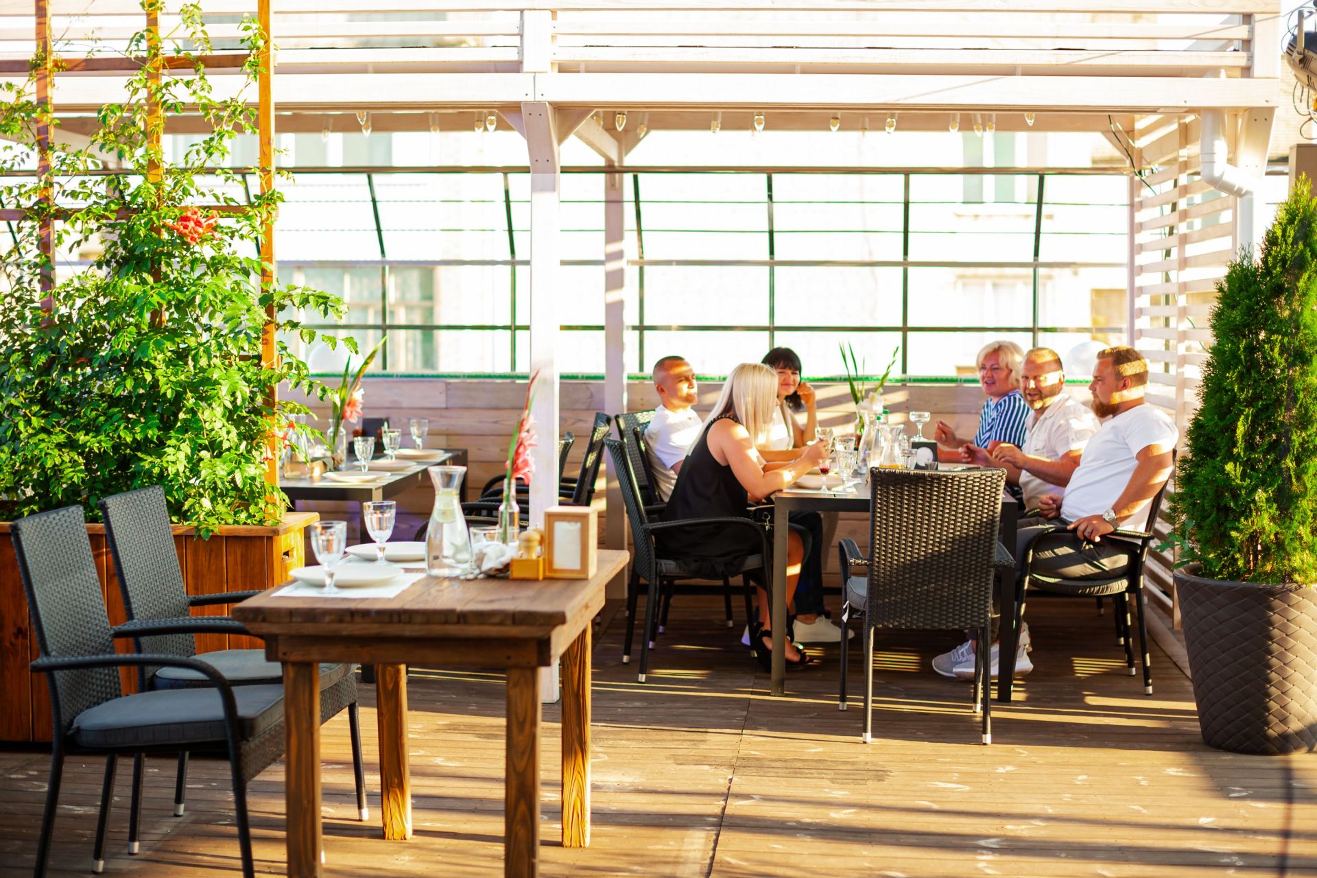 Любителям відпочинку на свіжому повітрі ресторан пропонує, вище згадану, велику терасу з неабияким виглядом на місто. Відпочиваючи у ресторані, ми зможете спостерігати за життям одного з найулюбленіших місць вінничан — проспектом Космонавтів та його окрасою, пішохідним фонтаном.