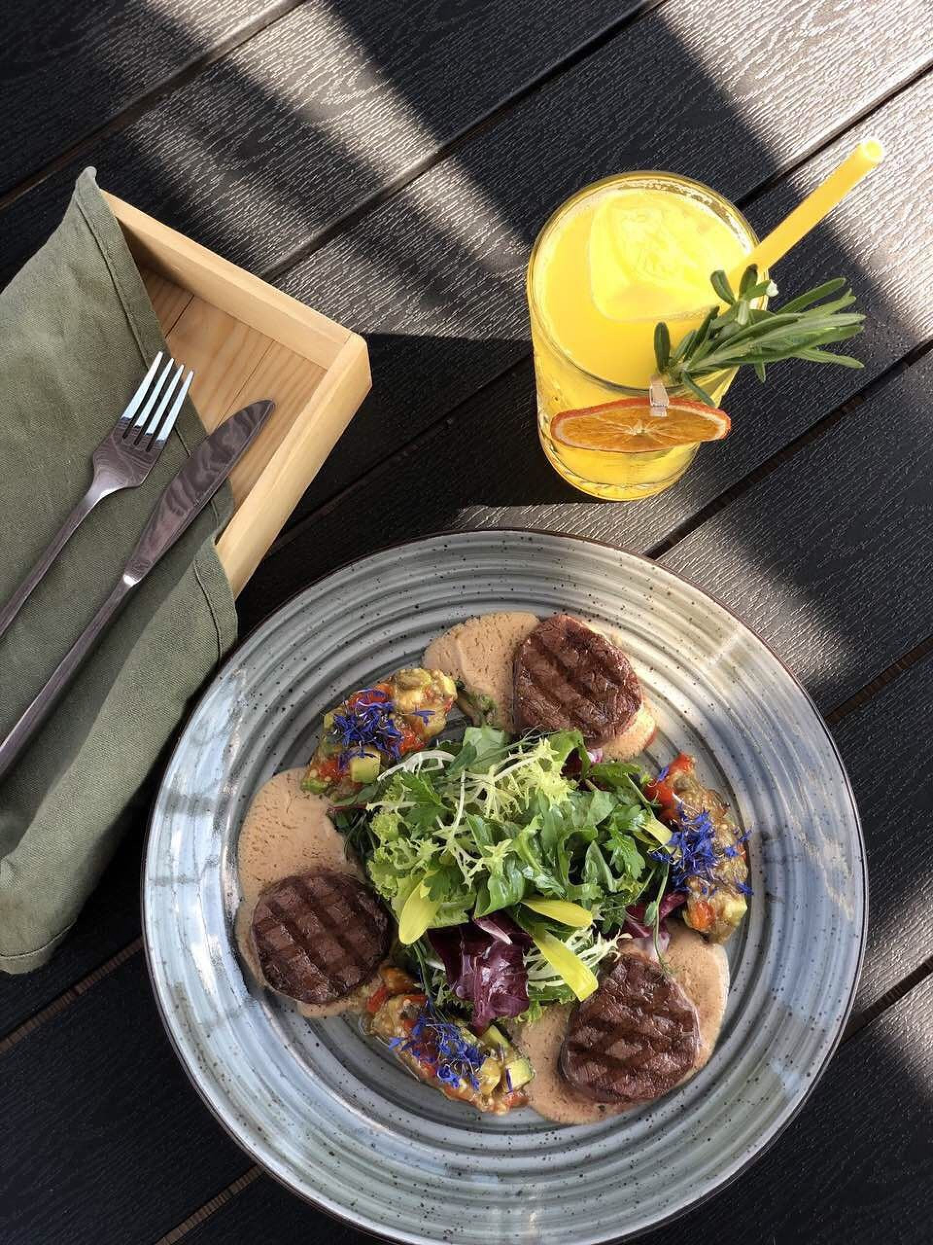 Лише тут ви зможете скуштувати манзарі, лежні з домашнім сиром, вареники з судаком та кав’яром з оселедця. А на десерт — кекс ромовий із заварним кремом чи крафтове печиво. Кухарі закладу розробляли меню ресторану так, аби якнайкраще відкрити гостям смак локальної кухні. Тут готують корисну та натуральну їжу з використанням місцевого фермерського продукту. Крім того, у ресторації є оригінальна барна і винна карта.