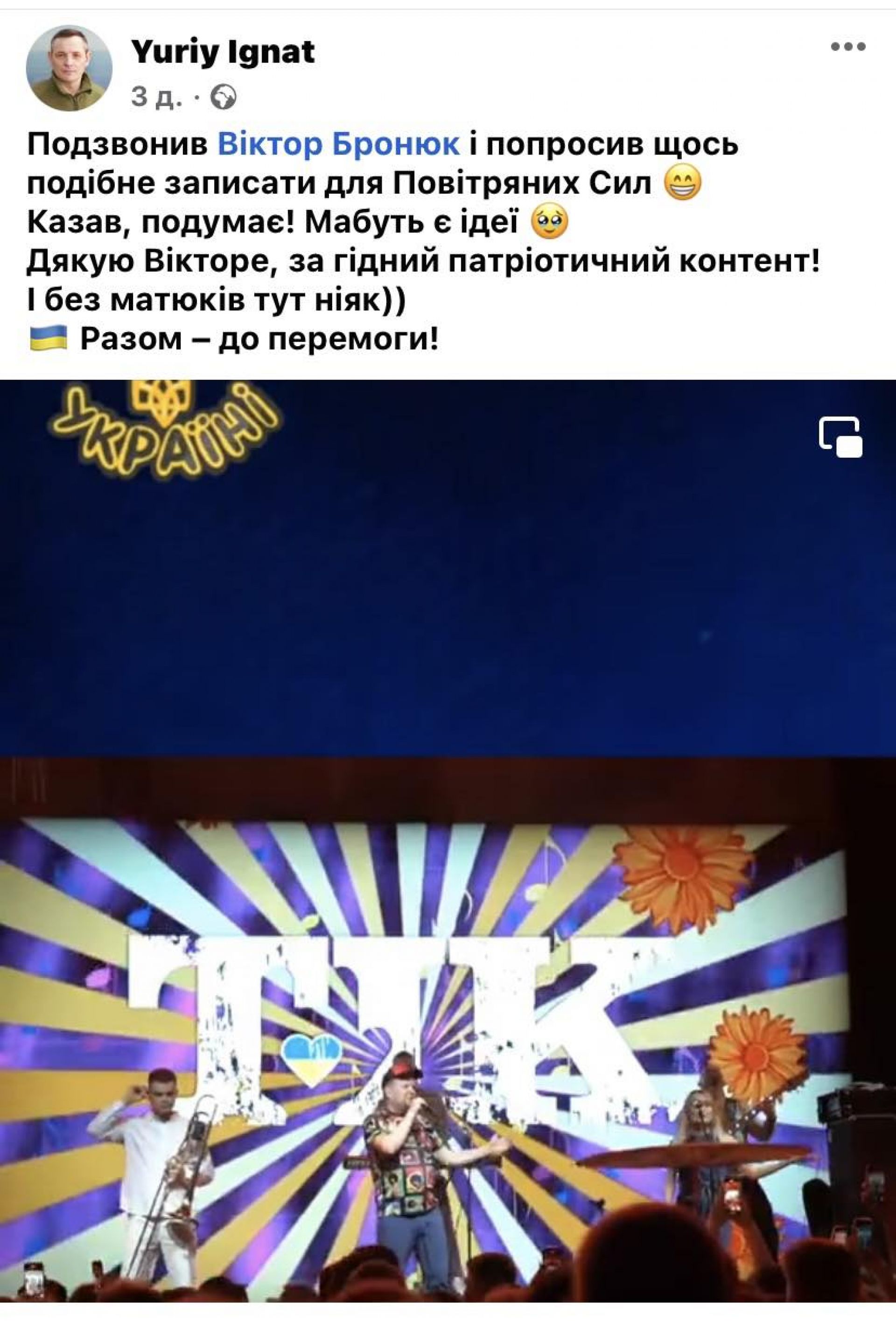 — Подзвонив Віктору Бронюку і попросив щось подібне записати для Повітряних Сил! Казав, подумає! Мабуть, є ідеї. Дякую, Вікторе, за гідний патріотичний контент! І без матюків тут ніяк) Разом — до перемоги!