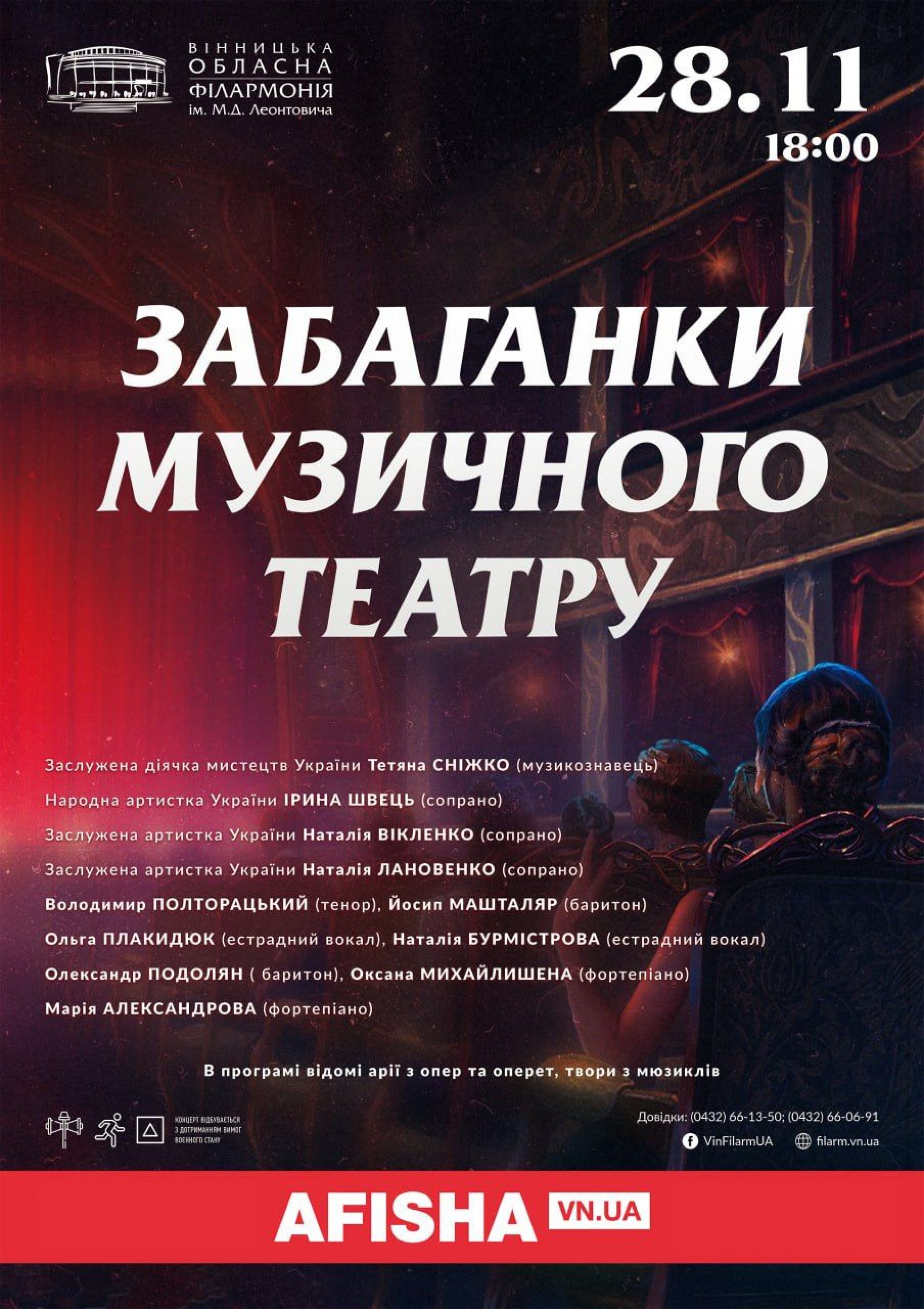 - У листопаді вінничани і гості міста зможуть відчути себе у бароковій Венеції в гостях у мегазірки всіх часів Маестро Антоніо Вівальді, насолодитися усіма музичними жанрами від джазу і класичного кросоверу до поп-музики і нестримного року на вибуховому концерті «The show must go on», поринути у красу народних обрядів, пісень і танців на концерті «Сонячне коло» ансамблю «Поділля», пережити найсильніші емоції на концерті «Питання без відповіді» Симфонічного оркестру, дізнатися все про курйози і таємниці найвідоміших музичних театрів світу й почути арії з культових мюзиклів, опер і оперет на концерті «Забаганки музичного театру» та підспівувати всією залою на феєричному вечорі «У ритмі суперхітів» хору «Леонтович-капела».