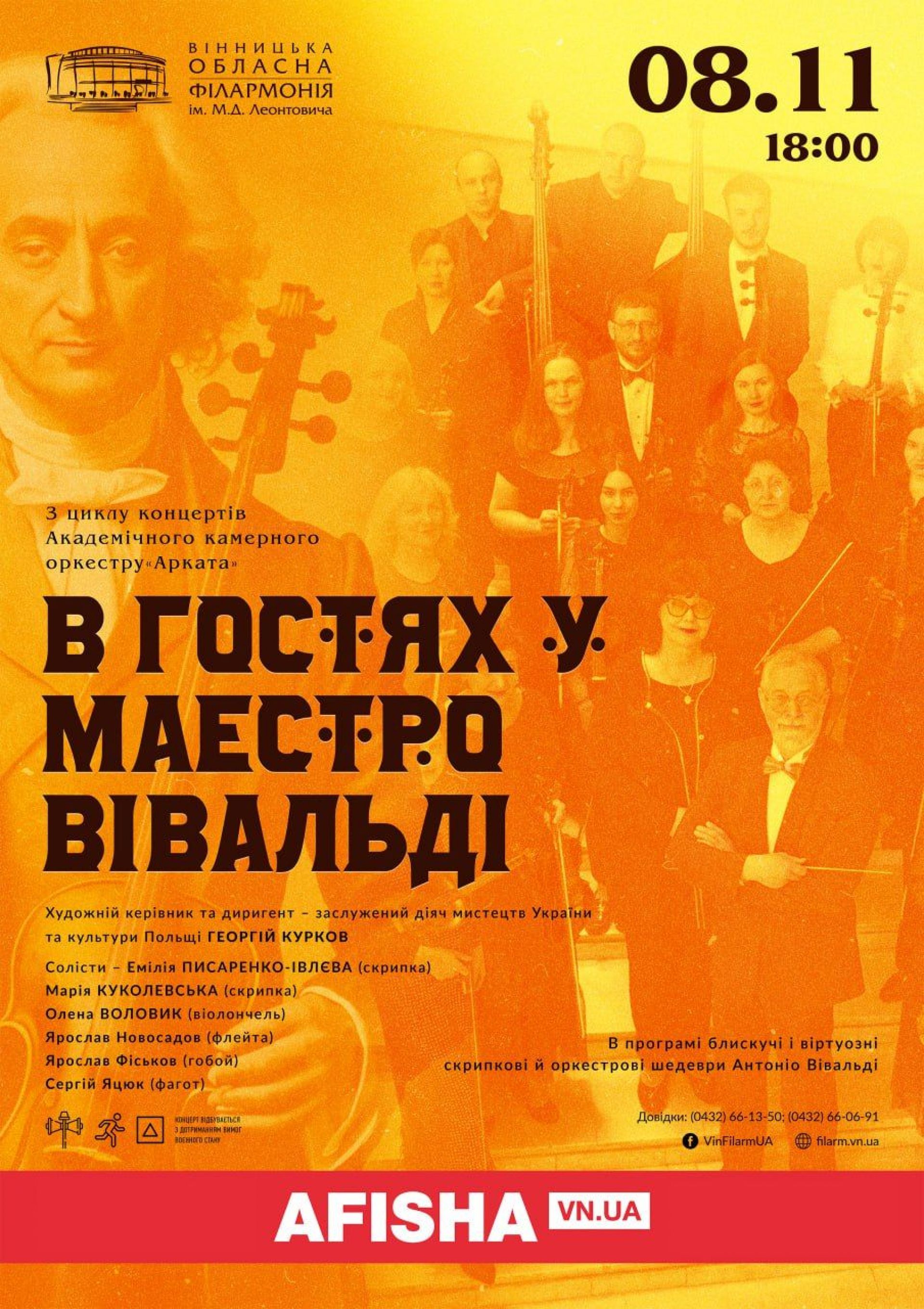 У середу, 8 листопада, о 18.00 у філармонії Академічний камерний оркестр «Арката» запрошує всіх до барокової Венеції у гості до мегазірки всіх часів Маестро Антоніо Вівальді.
