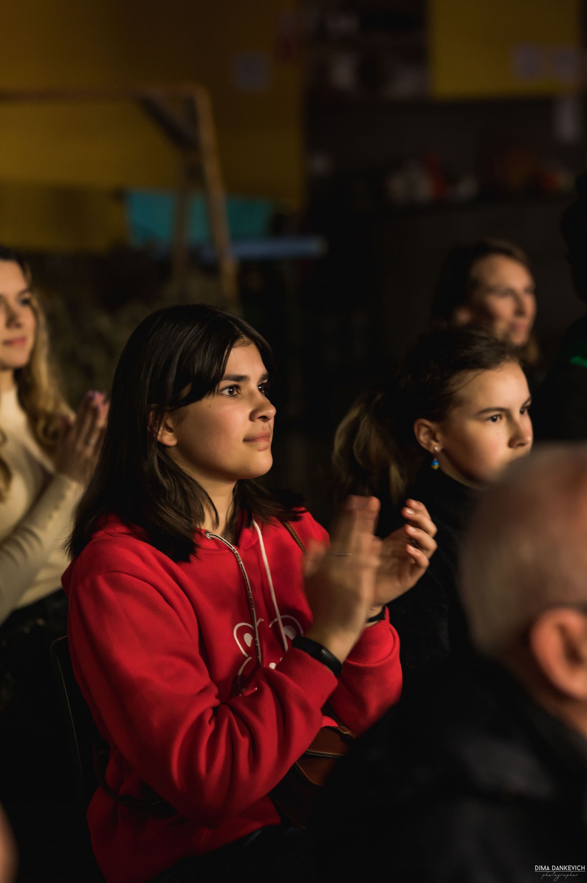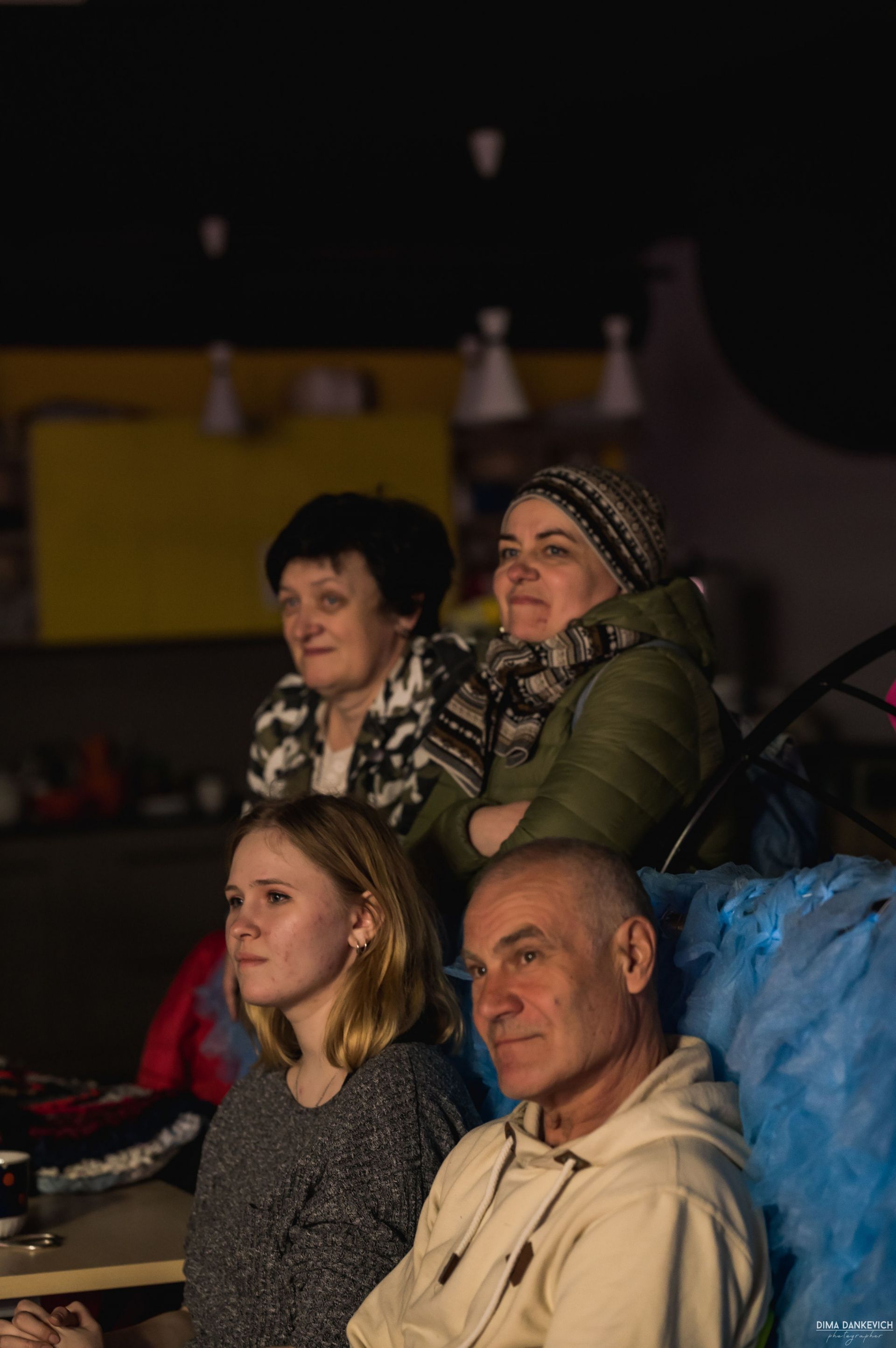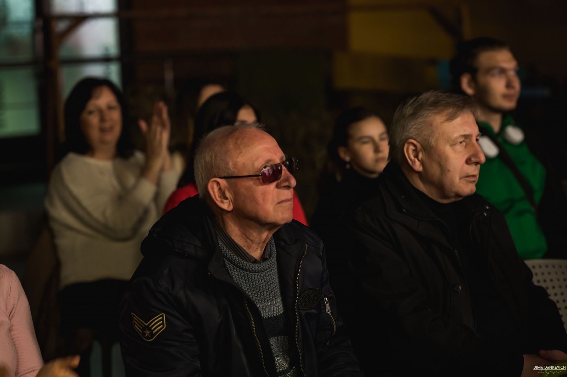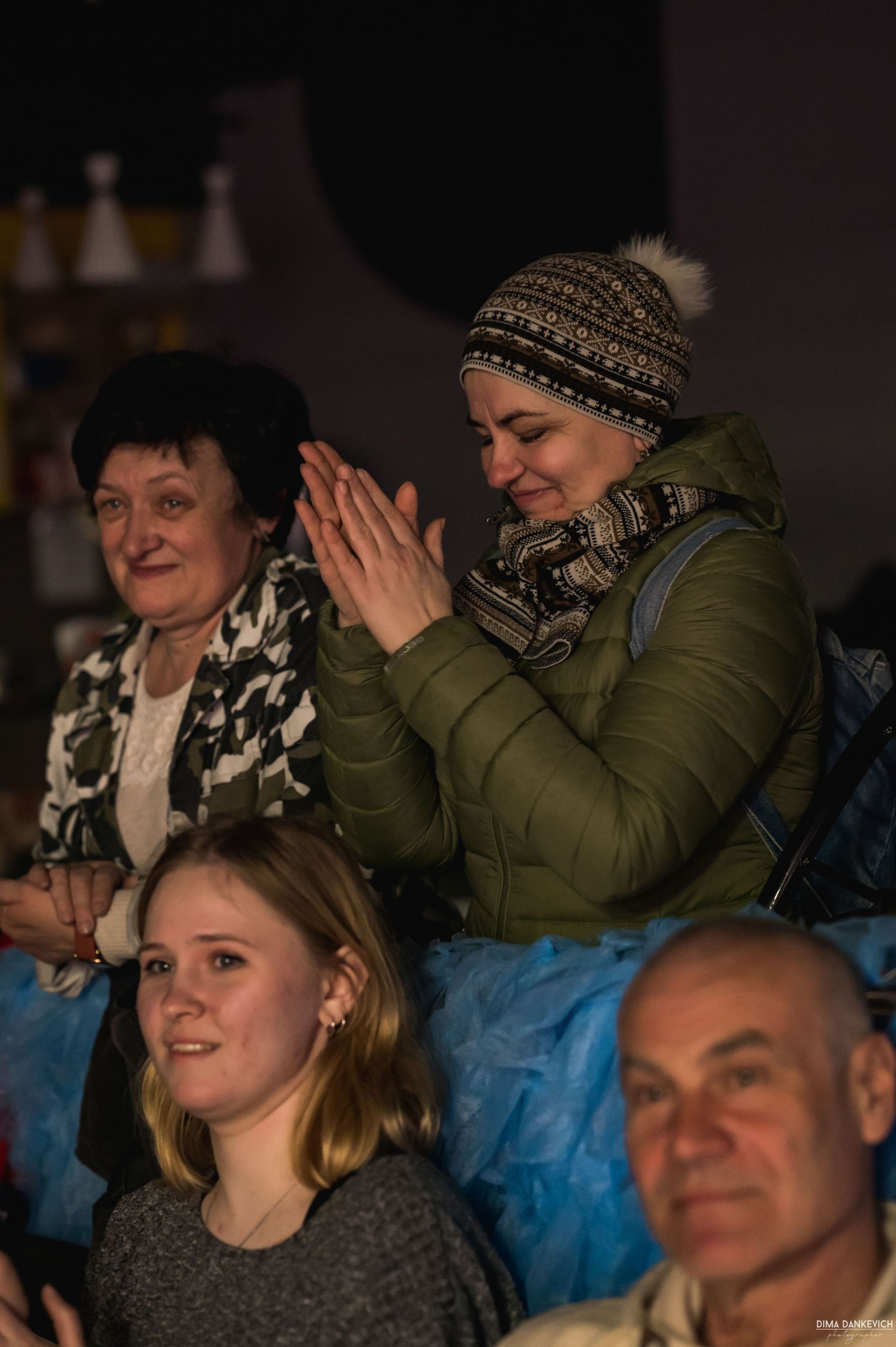 — Ми віримо, що перемога буде якомога швидше і над нашою країною буде мирне небо. Адже ми, українці, як ніколи згуртовані! Ми всі разом! Ми хочемо подякувати всім тим, хто стали на захист нашої рідної країни: це Збройні сили України, Нацгвардія, поліція і, звісно, волонтери, яких сьогодні багато у цій залі. Ми, артисти театру, зараз також волонтери: відшиваємо балаклави, плетемо маскувальні сітки, робимо все, що можемо. Але сьогодні вирішили зробити те, що у нас все-таки виходить трішечки краще — подарувати всім, хто живе і нині знаходиться у Вінниці, тепло, світло і радісні емоції, — відзначив ведучий вечора, актор театру ім. Садовського Андрій Богданов. — Ми щиро дякуємо «Квадрату» і нашій адміністрації за те, що щочетверга артисти нашого театру мають нагоду виступати на цій імпровізованій сцені й долучати вінничан і вимушених переселенців до мистецтва, щоб кожний хоч на годинку відпочив і трішечки переключився від воєнних реалій, які зараз хвилюють серце кожного з нас.