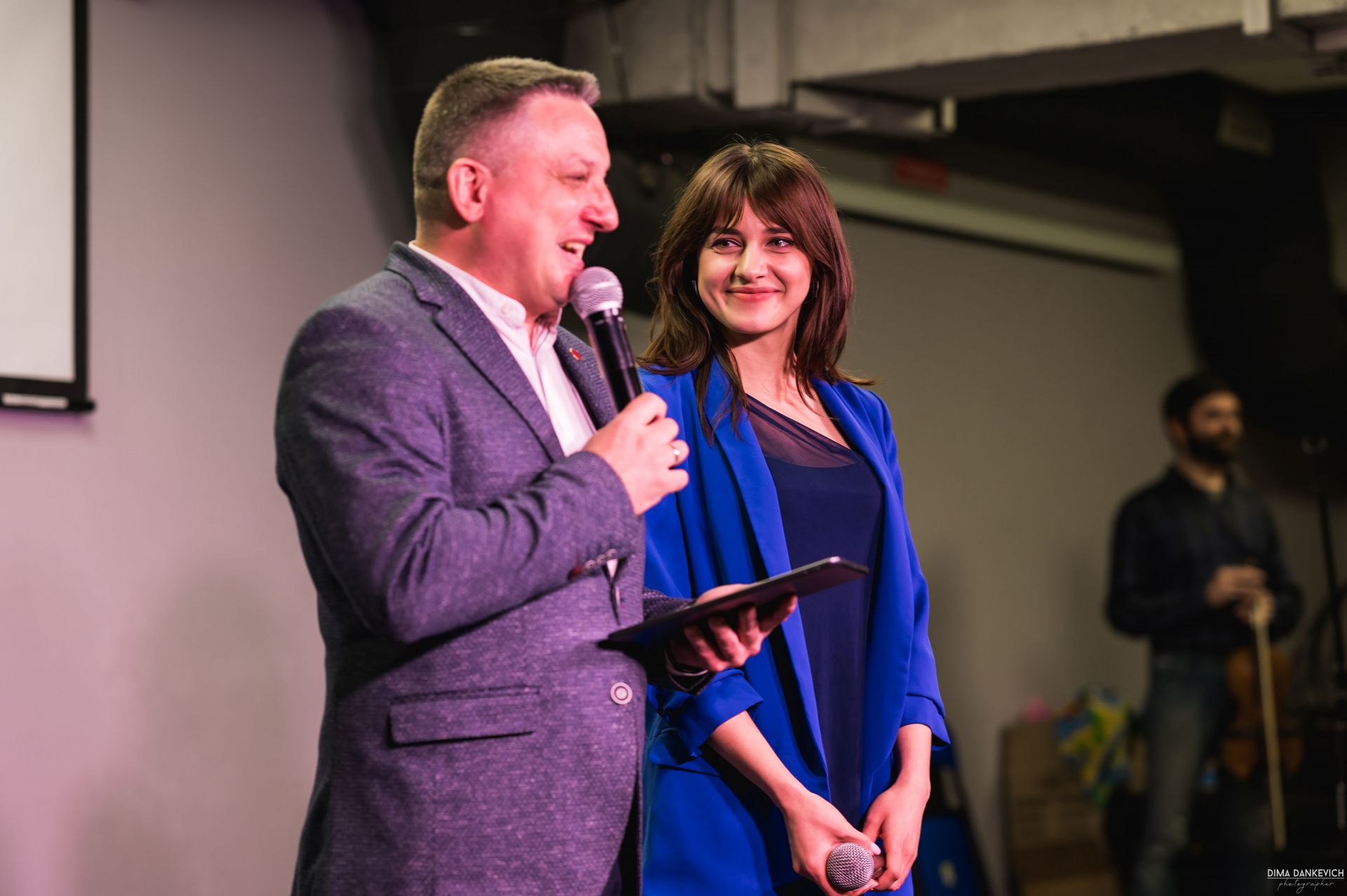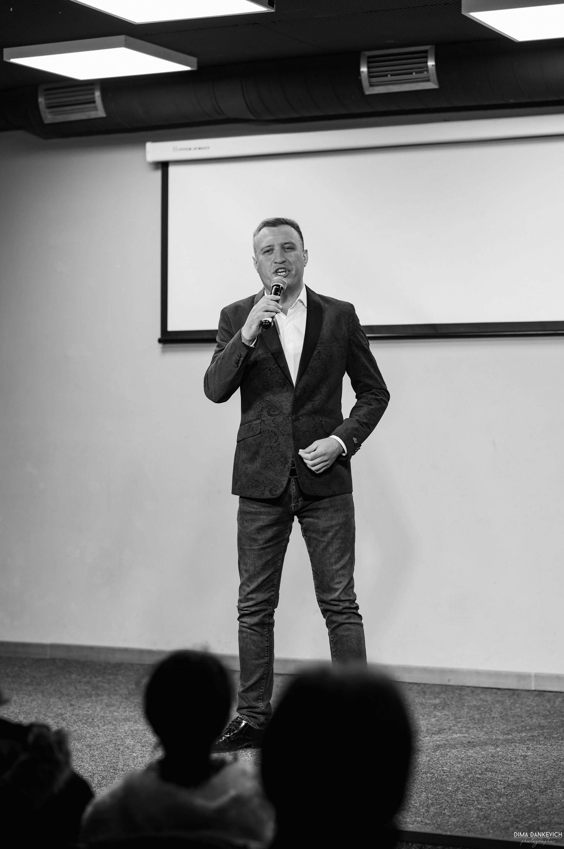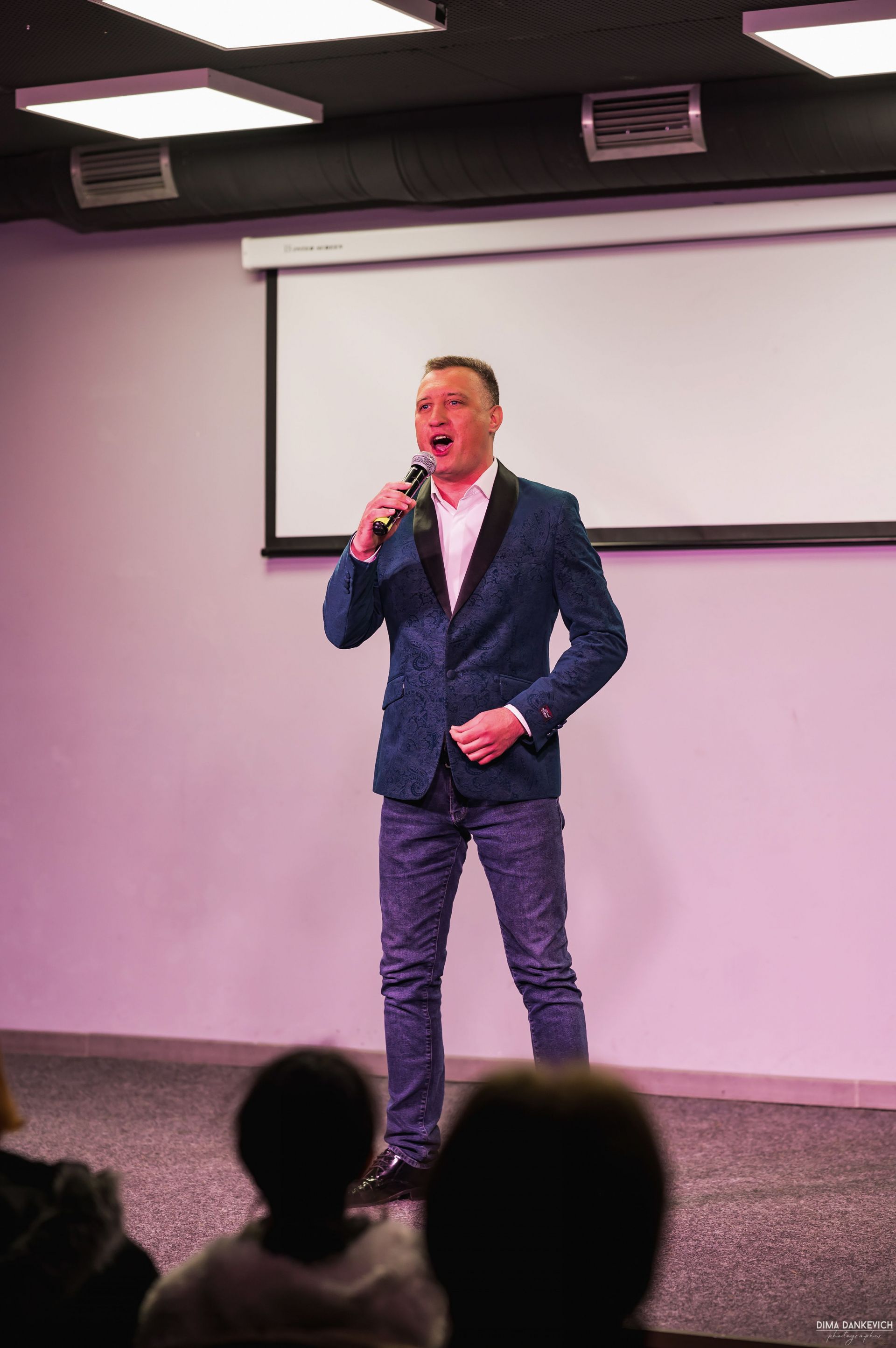 — Ми віримо, що перемога буде якомога швидше і над нашою країною буде мирне небо. Адже ми, українці, як ніколи згуртовані! Ми всі разом! Ми хочемо подякувати всім тим, хто стали на захист нашої рідної країни: це Збройні сили України, Нацгвардія, поліція і, звісно, волонтери, яких сьогодні багато у цій залі. Ми, артисти театру, зараз також волонтери: відшиваємо балаклави, плетемо маскувальні сітки, робимо все, що можемо. Але сьогодні вирішили зробити те, що у нас все-таки виходить трішечки краще — подарувати всім, хто живе і нині знаходиться у Вінниці, тепло, світло і радісні емоції, — відзначив ведучий вечора, актор театру ім. Садовського Андрій Богданов. — Ми щиро дякуємо «Квадрату» і нашій адміністрації за те, що щочетверга артисти нашого театру мають нагоду виступати на цій імпровізованій сцені й долучати вінничан і вимушених переселенців до мистецтва, щоб кожний хоч на годинку відпочив і трішечки переключився від воєнних реалій, які зараз хвилюють серце кожного з нас.