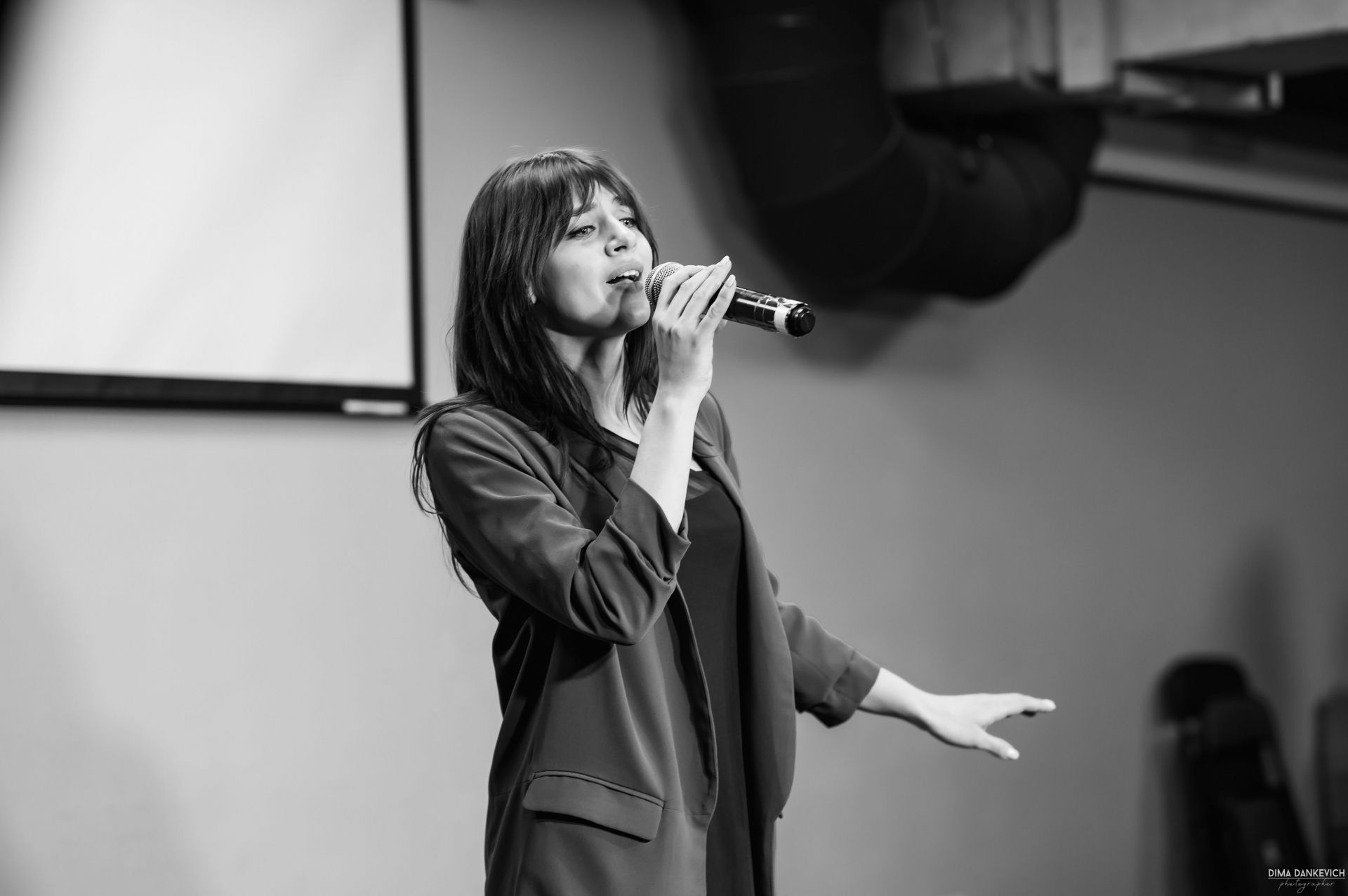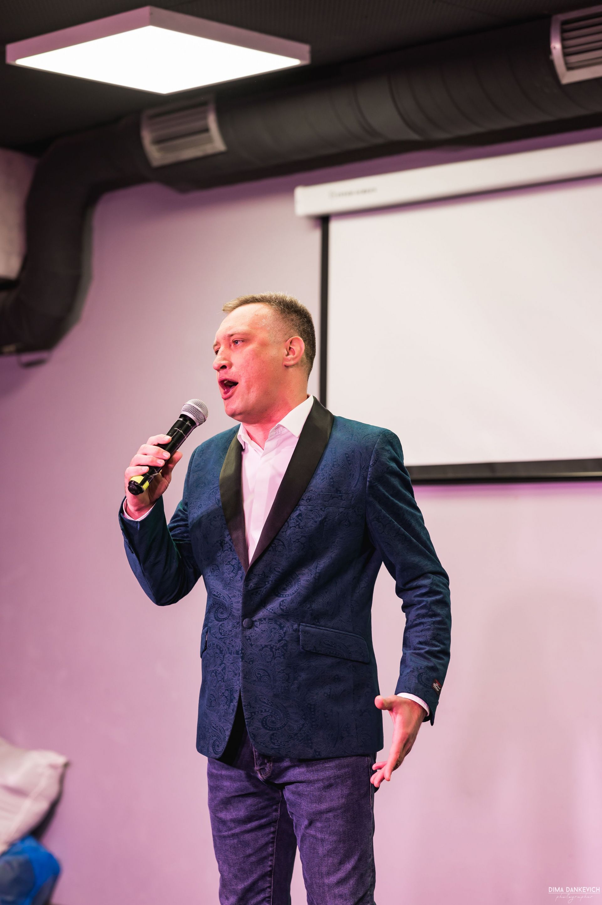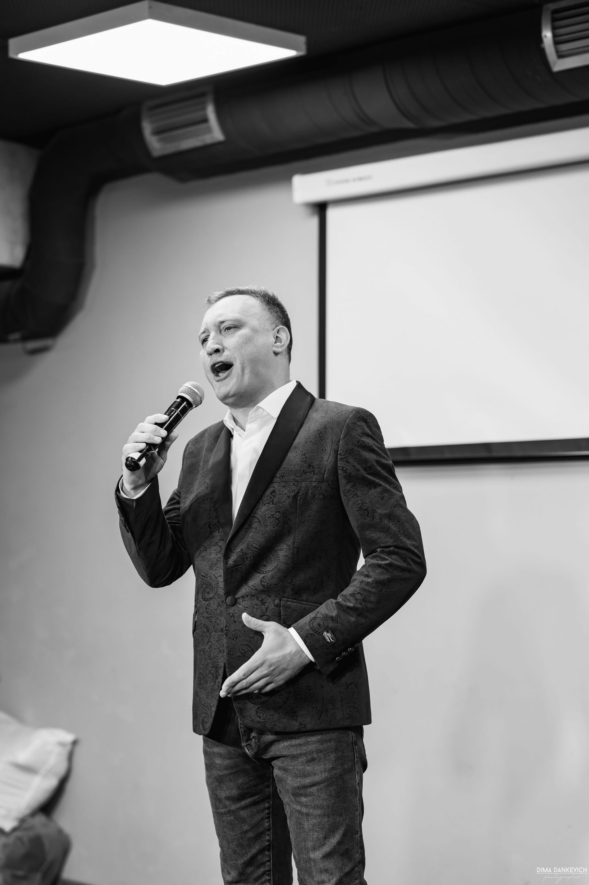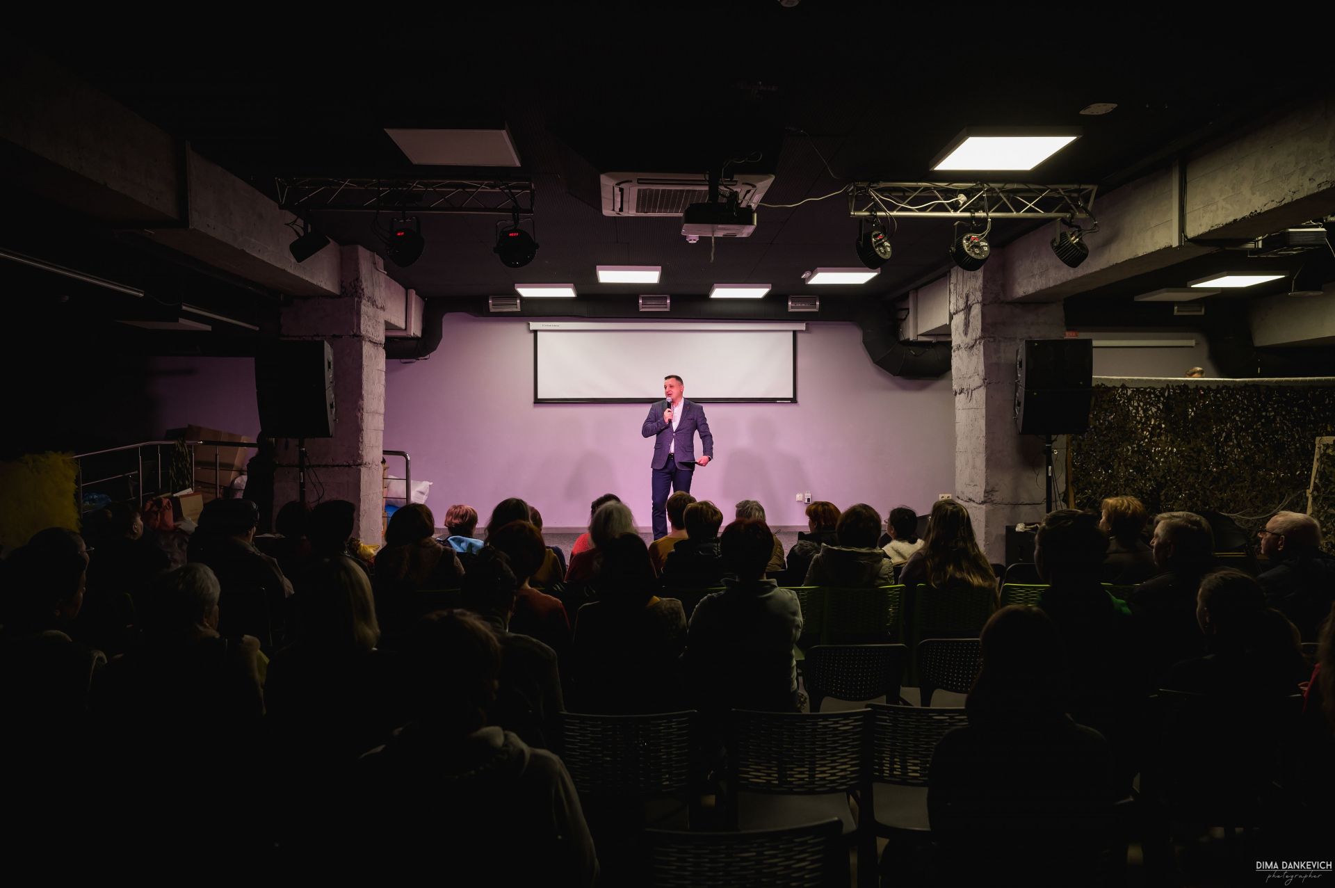 — Ми віримо, що перемога буде якомога швидше і над нашою країною буде мирне небо. Адже ми, українці, як ніколи згуртовані! Ми всі разом! Ми хочемо подякувати всім тим, хто стали на захист нашої рідної країни: це Збройні сили України, Нацгвардія, поліція і, звісно, волонтери, яких сьогодні багато у цій залі. Ми, артисти театру, зараз також волонтери: відшиваємо балаклави, плетемо маскувальні сітки, робимо все, що можемо. Але сьогодні вирішили зробити те, що у нас все-таки виходить трішечки краще — подарувати всім, хто живе і нині знаходиться у Вінниці, тепло, світло і радісні емоції, — відзначив ведучий вечора, актор театру ім. Садовського Андрій Богданов. — Ми щиро дякуємо «Квадрату» і нашій адміністрації за те, що щочетверга артисти нашого театру мають нагоду виступати на цій імпровізованій сцені й долучати вінничан і вимушених переселенців до мистецтва, щоб кожний хоч на годинку відпочив і трішечки переключився від воєнних реалій, які зараз хвилюють серце кожного з нас.