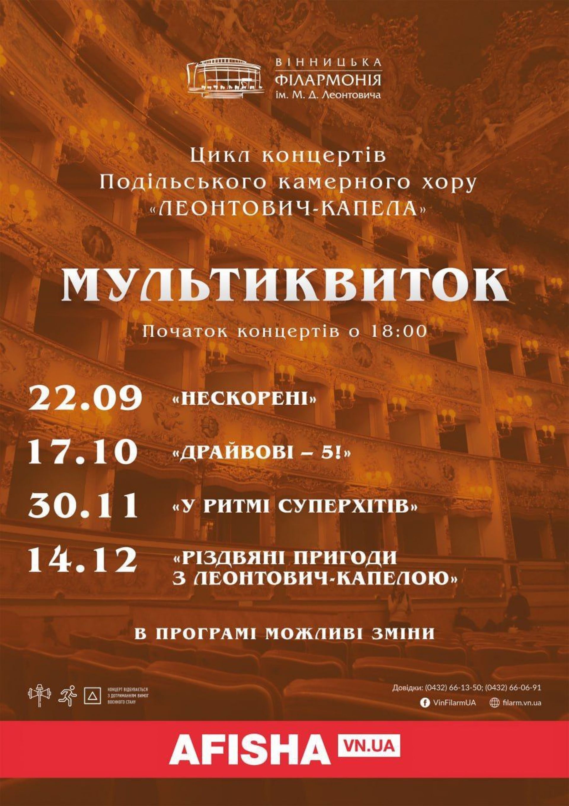 Мультиквиток циклу концертів Подільського камерного хору «Леонтович-капела»: 22 вересня — «Нескорені», 17 жовтня — «Драйвові — 5!», 30 листопада — «У ритмі суперхітів», 14 грудня — «Різдвяні пригоди з Леонтович-капелою».