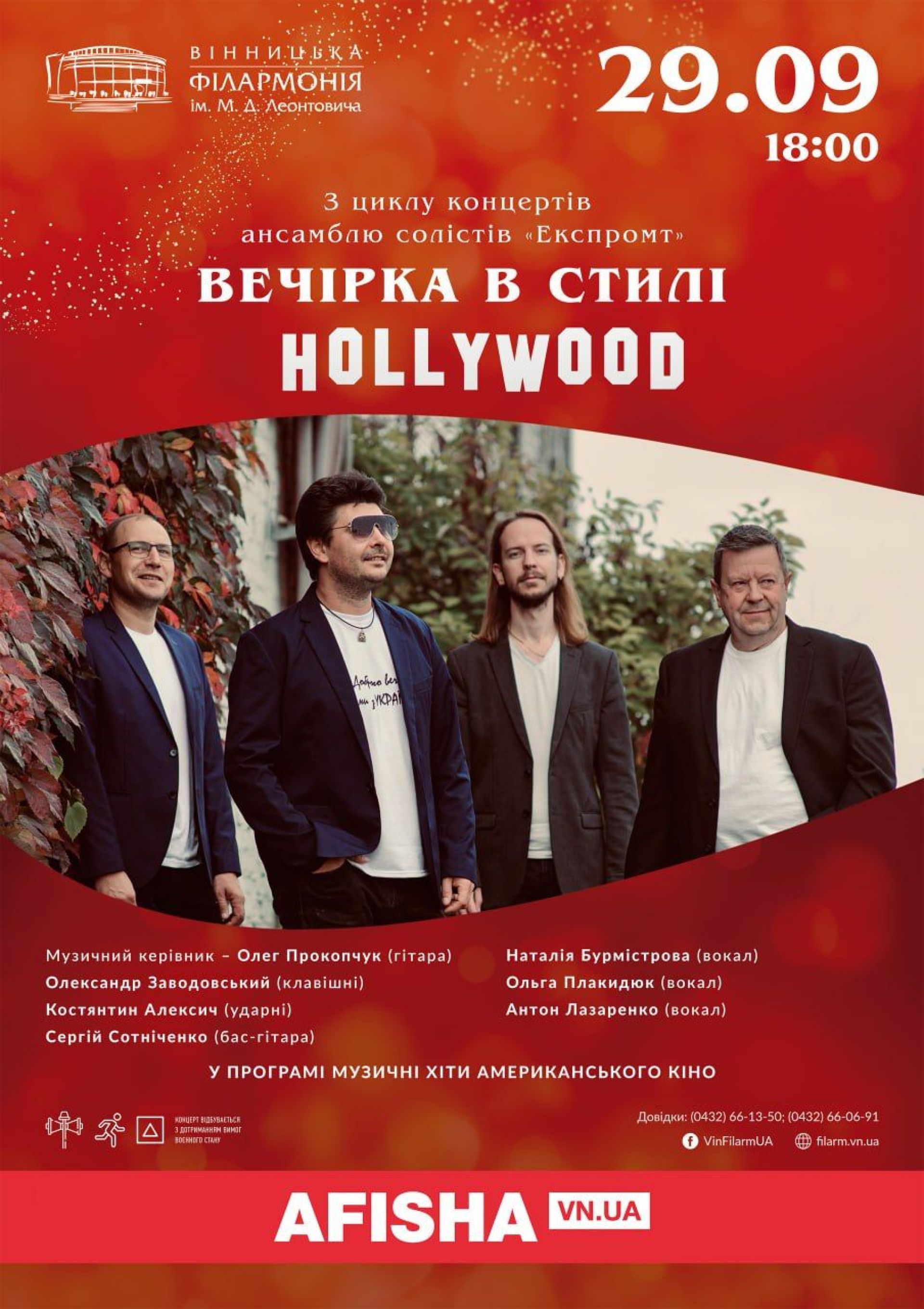 29 вересня о 18.00 у філармонії на концерті «Вечірка в стилі HOLLYWOOD» ансамбль «Експромт» вражатиме феєрією музичних хітів американського кіно.