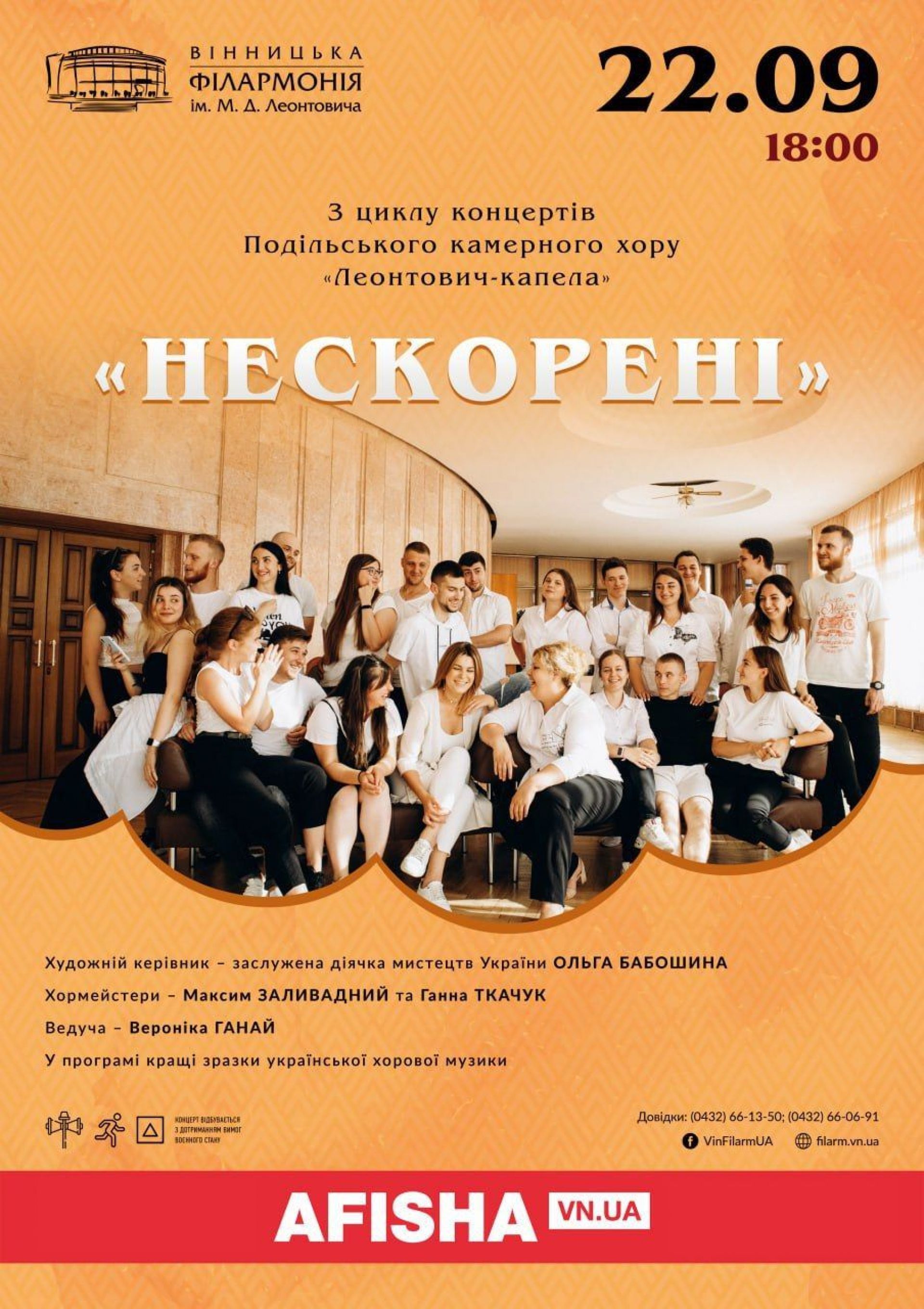 22 вересня о 18.00 у філармонії Подільський камерний хор «Леонтович-капела» презентує патріотичну програму «Нескорені».