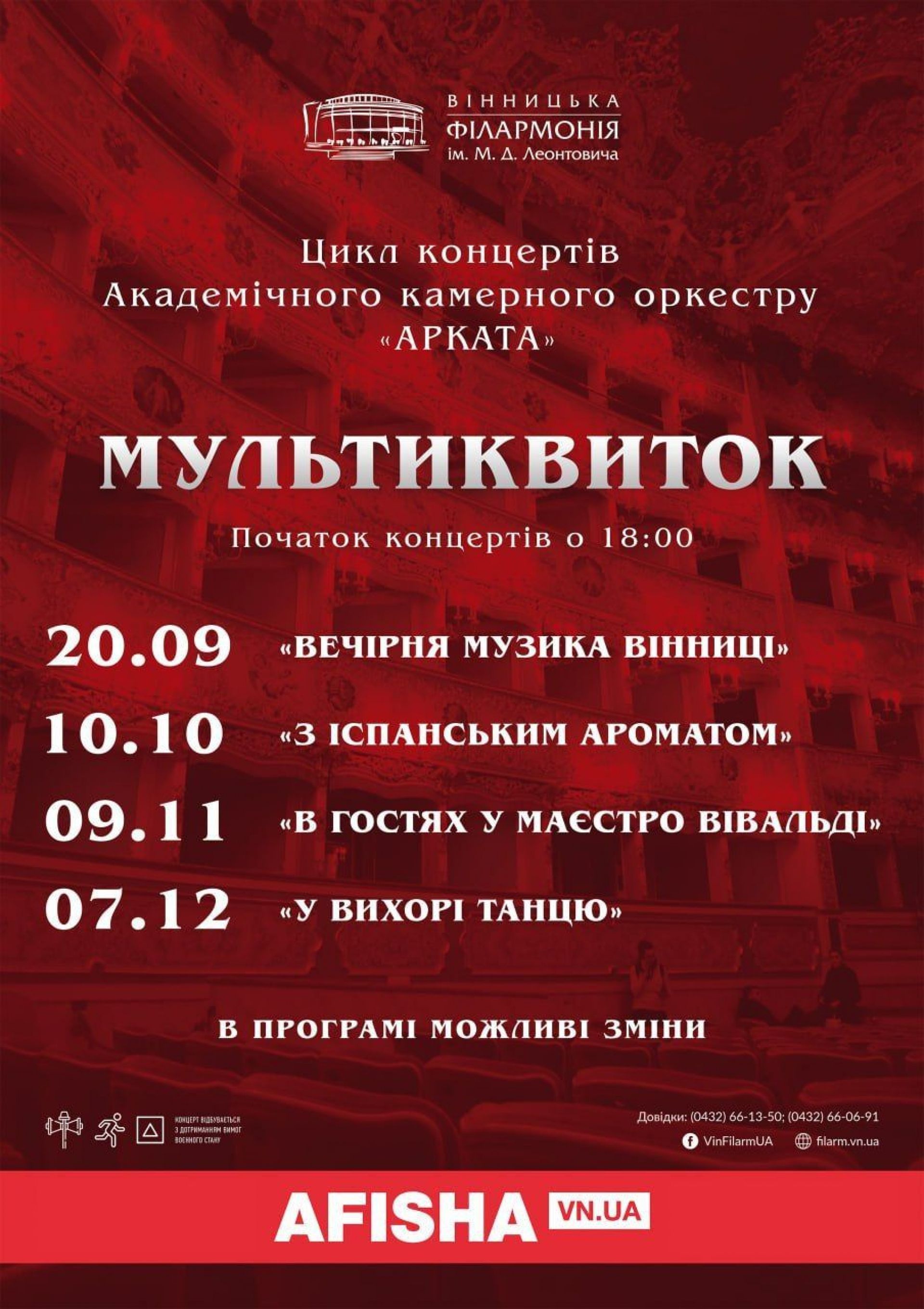 Мультиквиток циклу концертів Академічного камерного оркестру «Арката»: 20 вересня — «Вечірня музика Вінниці», 10 жовтня — «З іспанським ароматом», 9 листопада — «В гостях у маестро Вівальді», 7 грудня — «У вихорі танцю».