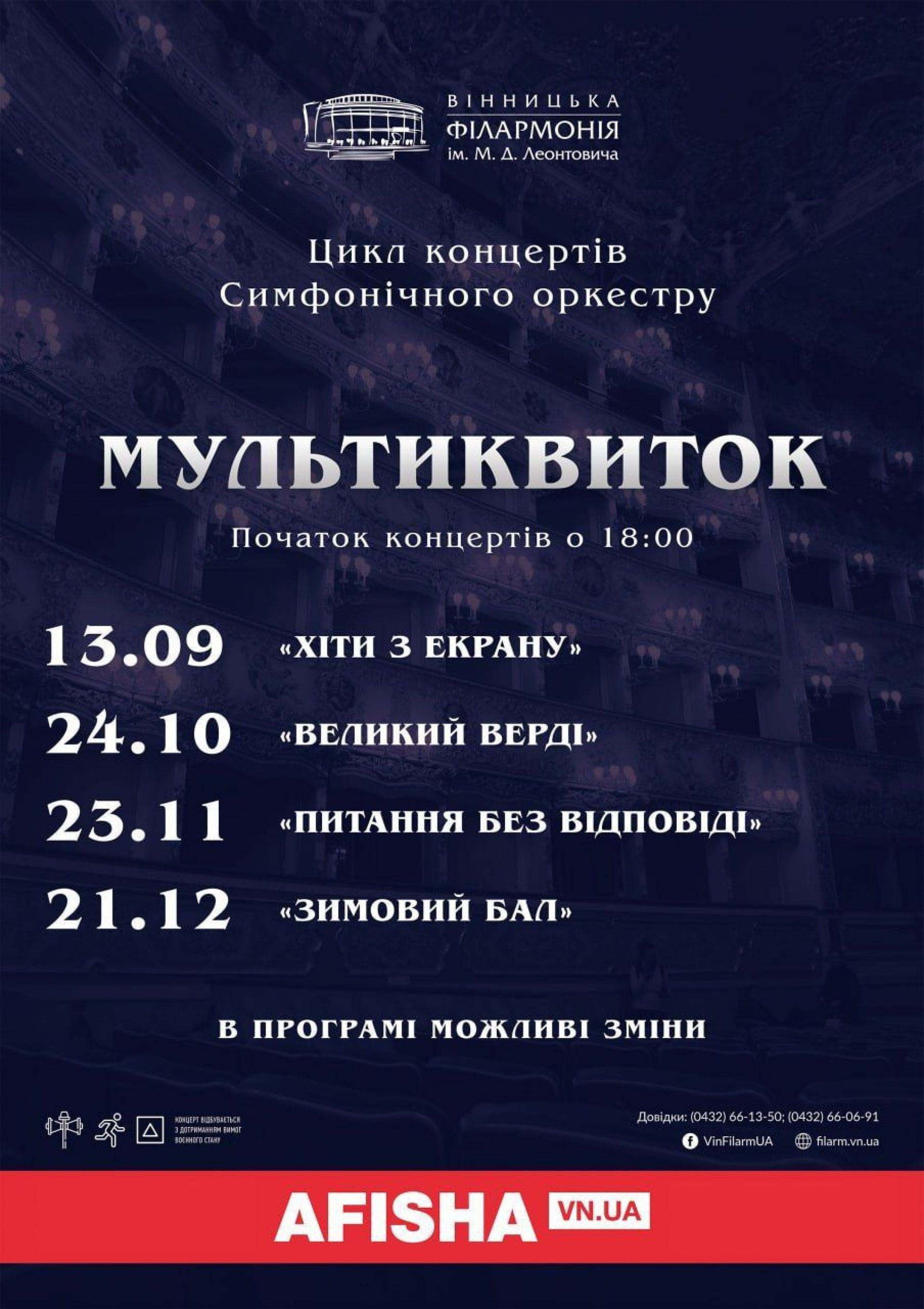 У мультиквиток циклу концертів Симфонічного оркестру включено такі події: 13 вересня — «Хіти з екрану», 24 жовтня — «Великий Верді», 23 листопада — «Питання без відповіді», 21 грудня — «Зимовий бал».