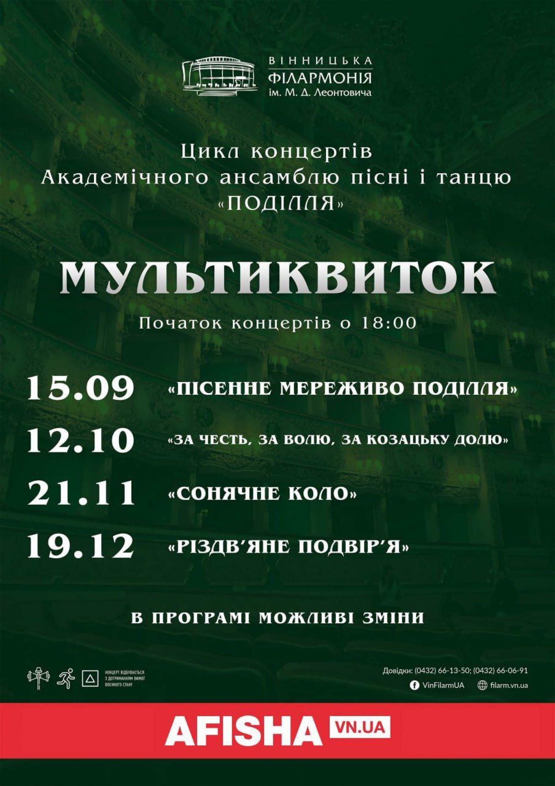 Мультиквиток циклу концертів Академічного ансамблю пісні і танцю «Поділля»: 15 вересня — «Пісенне мереживо Поділля», 12 жовтня — «За честь, за волю, за козацьку долю», 21 листопада — «Сонячне коло», 19 грудня — «Різдвяне подвір’я».