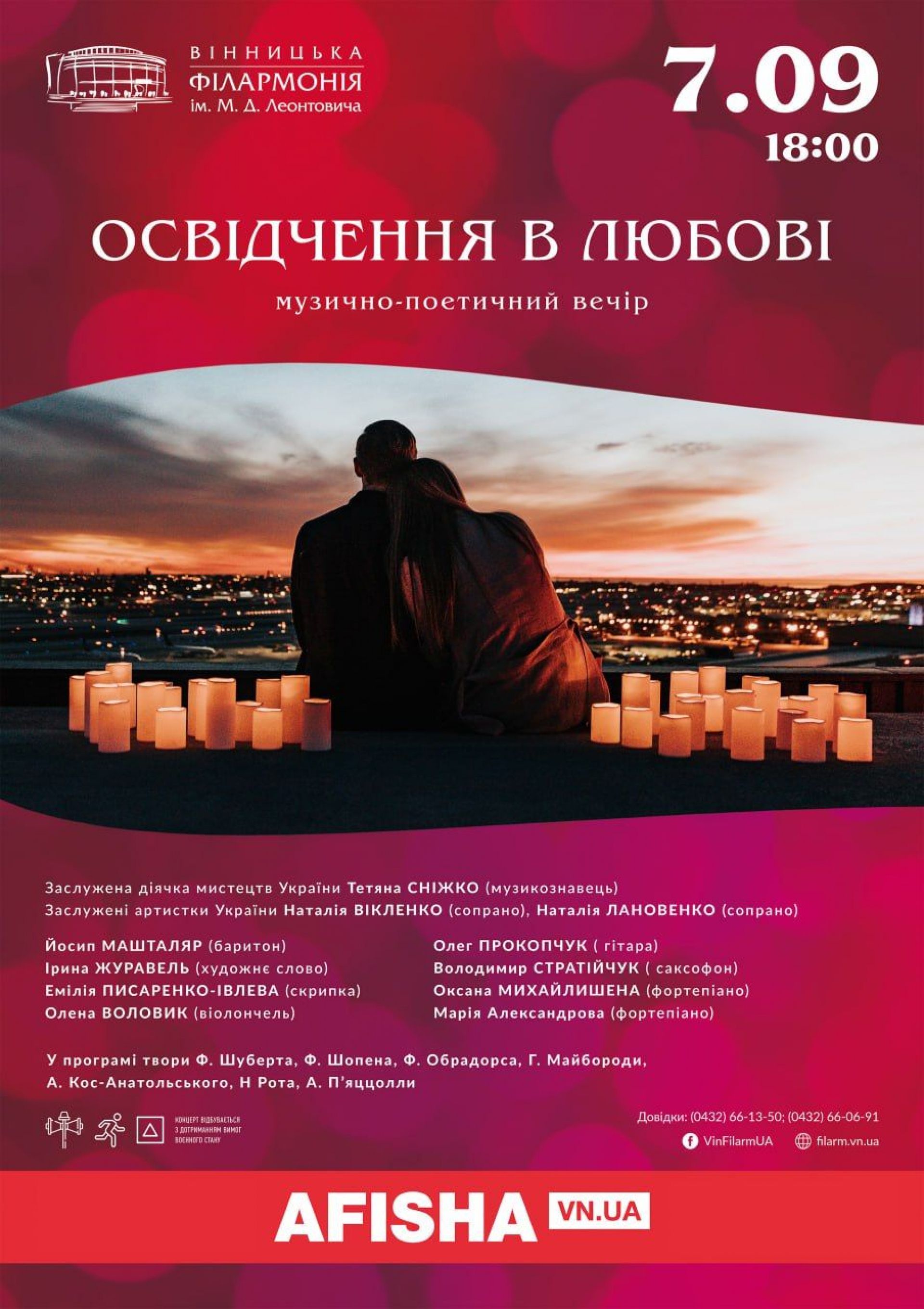 - У вересні вінничан і гостей міста чекають сім незабутніх концертів: «Освідчення в любові» з музикою П’яццолли і віршами Жадана, культові саундтреки і шоу «Хіти з екрану» від Симфонічного оркестру, вишуканий фольклор і «Пісенне мереживо Поділля», «Вечірня музика Вінниці» від камерного оркестру «Арката», патріотичний концерт «Нескорені» від хору «Леонтович-капела», запальна «Вечірка в стилі HOLLYWOOD», а також концерт «Оберіг» від артистів Хмельницької обласної філармонії.