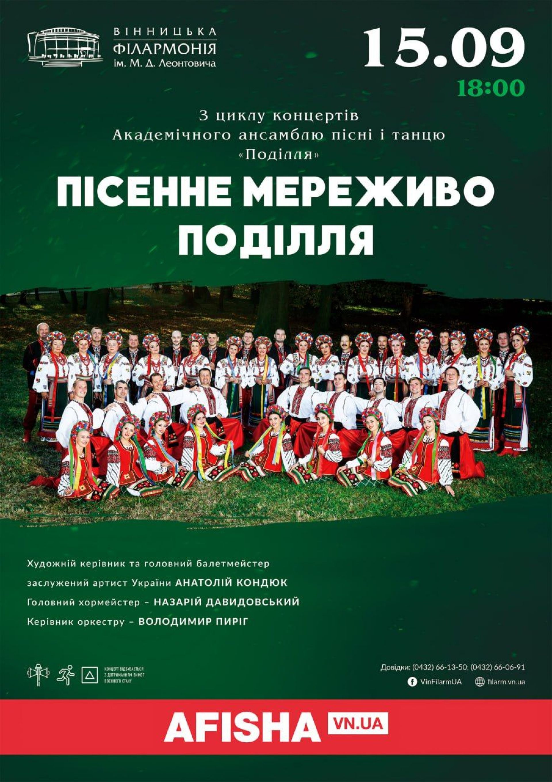 15 вересня о 18.00 у філармонії яскравою концертною програмою «Пісенне мереживо Поділля» вражатиме славетний Академічний ансамбль пісні і танцю «Поділля».