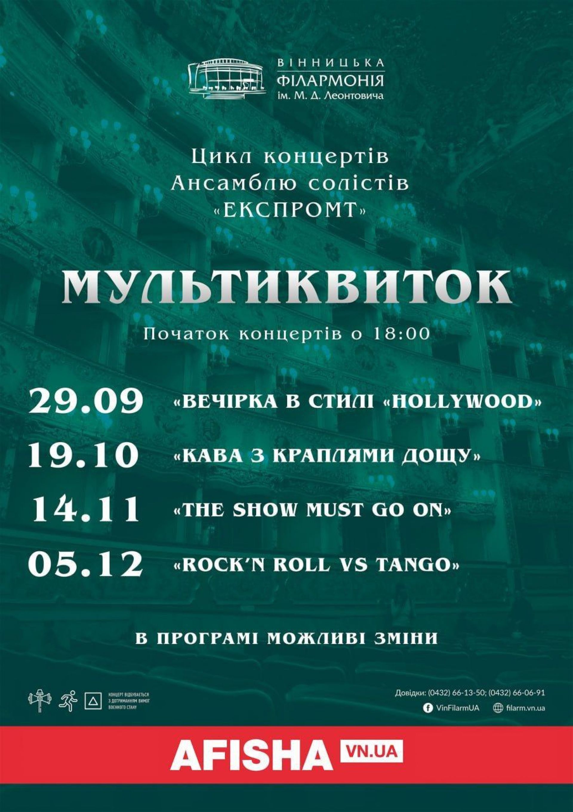 Мультиквиток циклу концертів Ансамблю солістів «Експромт»: 29 вересня — «Вечірка в стилі HOLLYWOOD», 19 жовтня — «Кава з краплями дощу», 14 листопада — «The show must go on», 5 грудня — «Rock'n'roll vs tango».