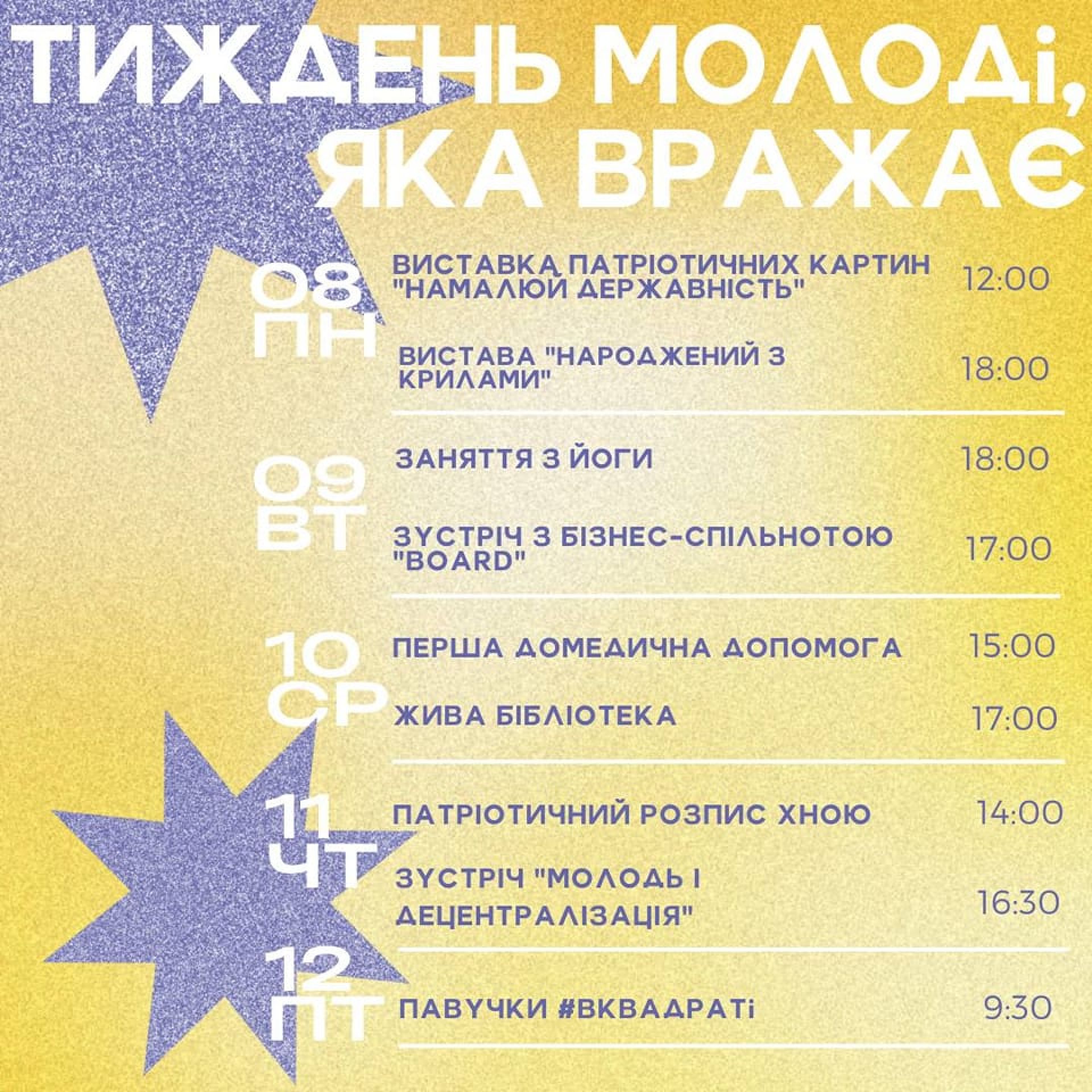 — Наша молодь цікава, сильна, мужня і непереборна! Саме молодь сьогодні захищає Україну, волонтерить, тримає економічний фронт, вчиться, будує та розвиває країну. Тому до Міжнародного Дня молоді у «Квадраті» ми не обмежувались лише одним днем, а з партнерами підготували тиждень активностей, зустрічей, тренінгів. Україна та українська молодь вражає весь світ своєю стійкістю та жагою до свободи і перемоги! — розповідає в.о. директорки «Квадрату» Анастасія Молдован. — Запрошуємо всіх провести цей тиждень у «Квадраті»! І дякуємо ЗСУ та всім захисникам за можливість працювати і творити у вільній Україні!