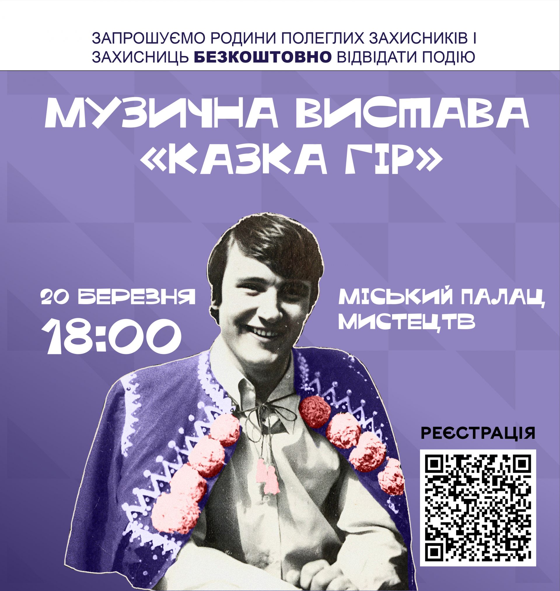 Безкоштовно побачити прекрасну музичну виставу «Казка гір» за мотивами творів Володимира Івасюка 20 березня о 18.00 у Міському палаці мистецтв «Зоря» зможуть родини полеглих та безвісти зниклих захисників і захисниць України.