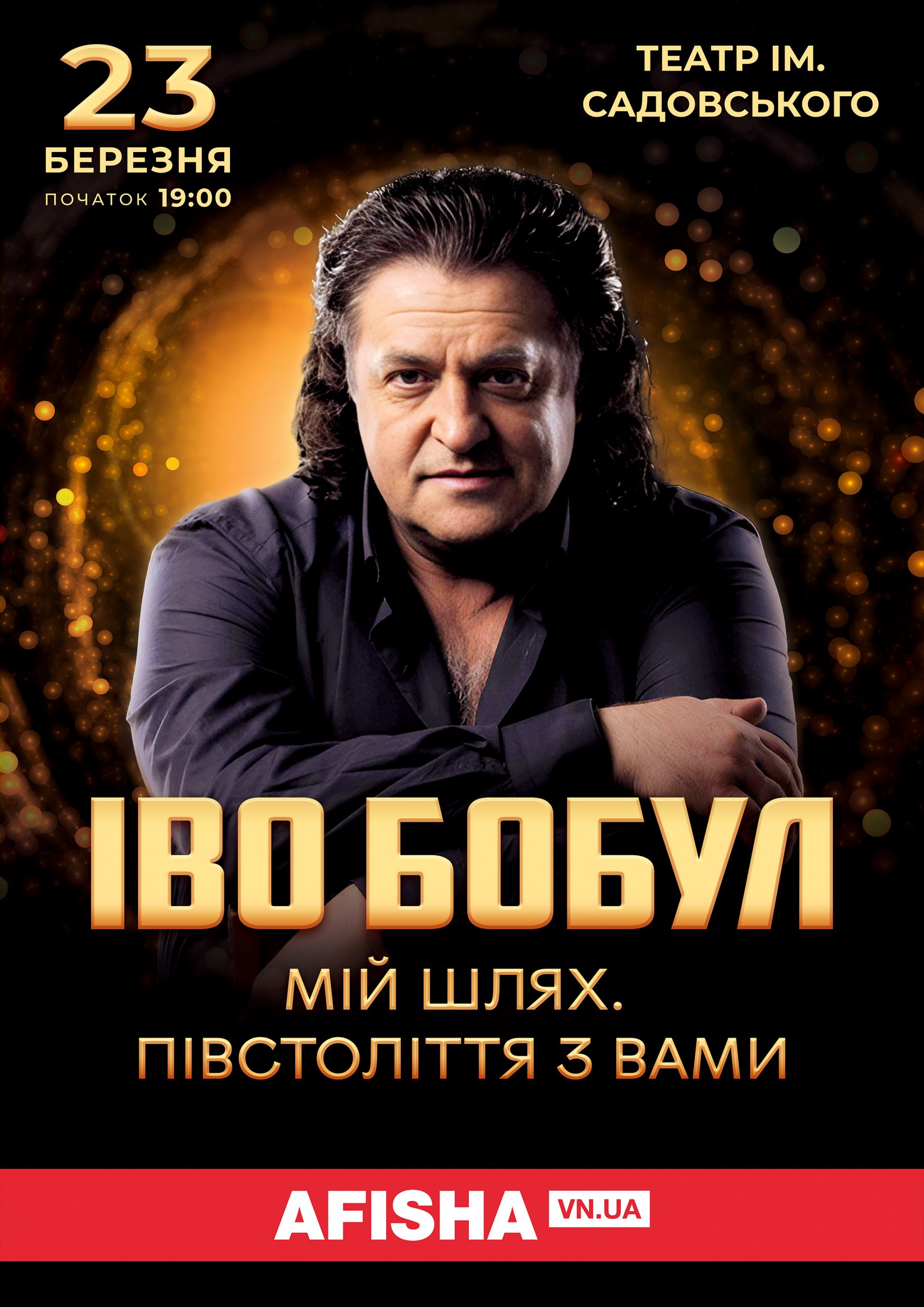 На великому ювілейному концерті «Мій шлях. Півстоліття з вами» 23 березня о 19.00 у Вінницькому театрі ім. Садовського, насолоджуючись золотими хітами «Розмова з тобою», «А липи цвітуть», «Серпанкові очі», «Kristina», «Все золото світу», «Осінній сад», «Не відпускай мене», «Вогонь мого кохання», «Пісне з полонини», «Марічка», «Одна-єдина», «Я чекав тебе», «Любов крізь літа», «Шторм кохання», свіжими прем’єрами «Солдат», «Білявка-зима», «Почуття» та багатьма іншими шедеврами, разом з легендарним народним артистом України Іво Бобулом ми проживемо його неповторний, тріумфальний і передусім — дуже щирий до глядачів! — шлях на сцені.