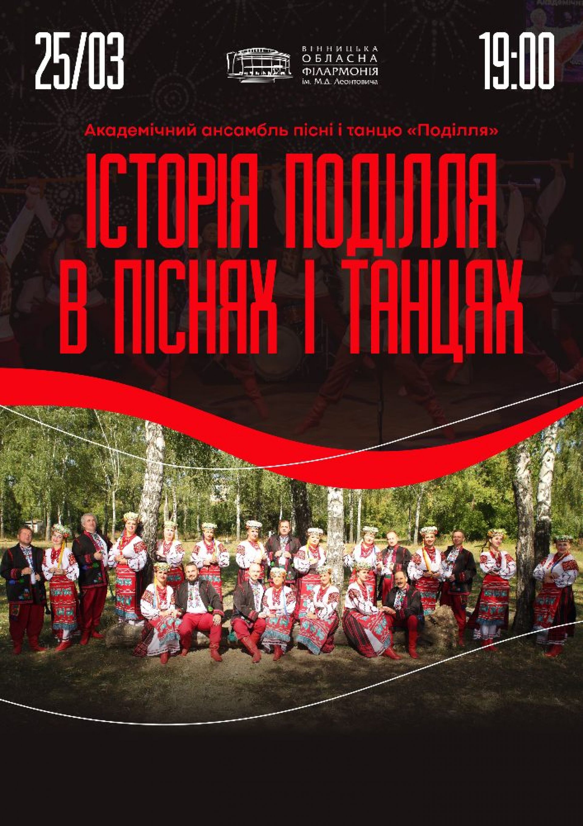 У форматі нон-стоп дійства 25 березня о 19.00 у Вінницькій обласній філармонії на унікальному концерті «Історія Поділля в піснях і танцях» розгорнеться масштабний перформанс, який відкриє всю красу історії та неповторних традицій Поділля.