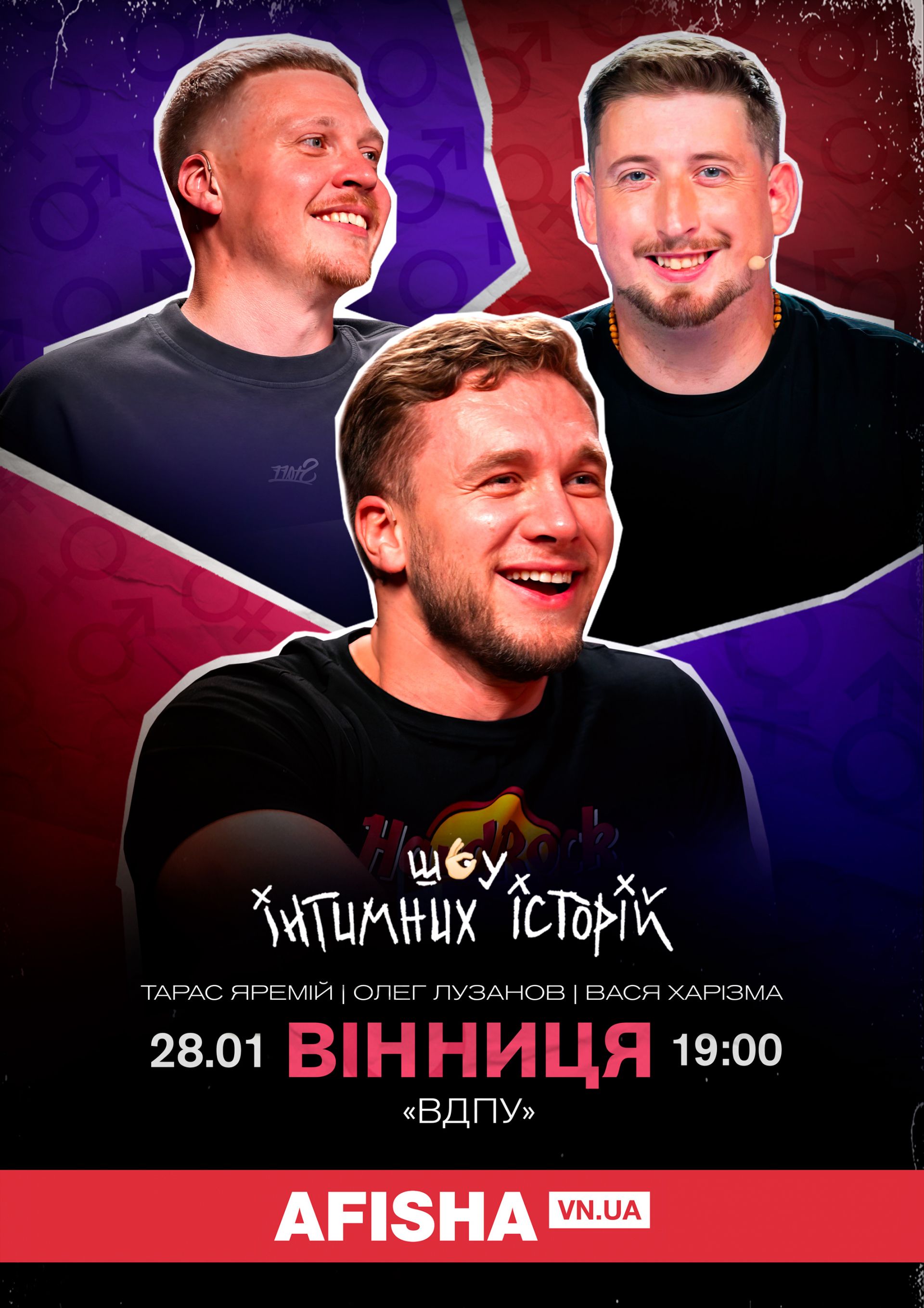 28 січня о 19.00 у концертній залі Вінницького педагогічного університету не пропустіть вибухове гумористичне шоу 18+ «Інтимні історії» від зірок українського стендапу: Тараса Яремія, Васі Харізми і Олега Лузанова.