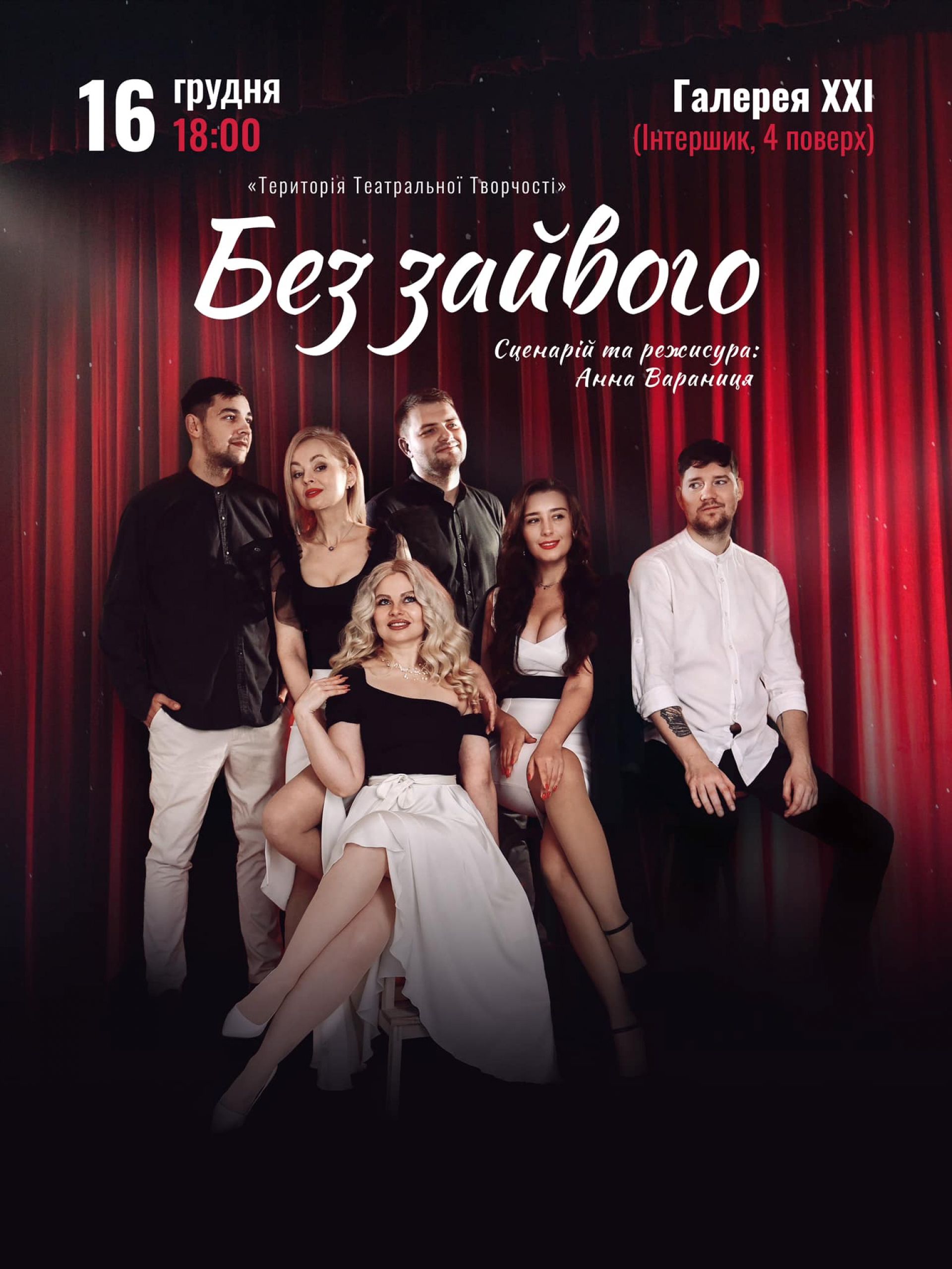 Особливим подарунком від вінницьких артистів 16 грудня о 18.00 у галереї XXI стане прем’єра нової вистава «Без зайвого» режисерки-постановниці Анни Вараниці і команди «Території Театральної Творчості».