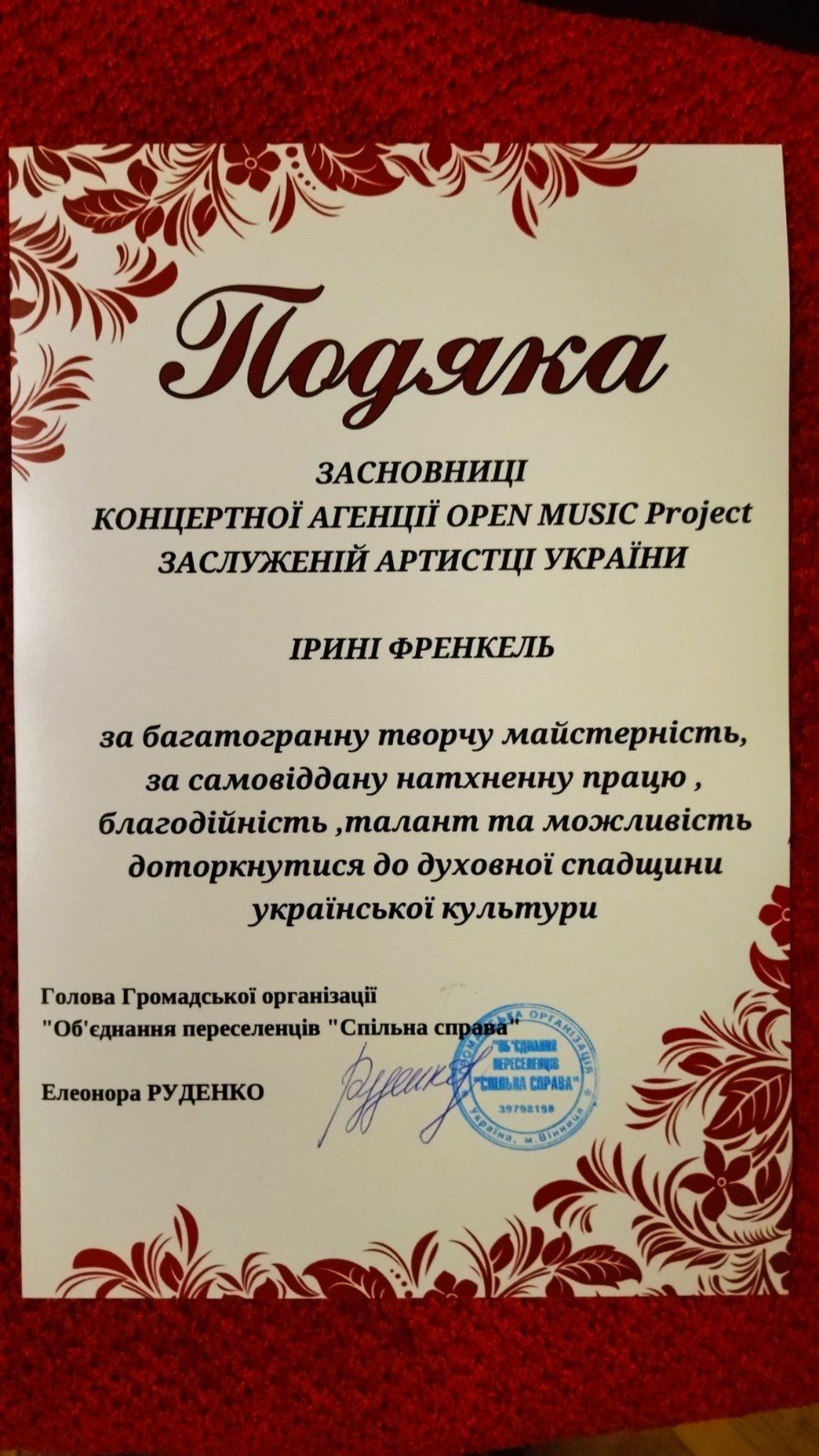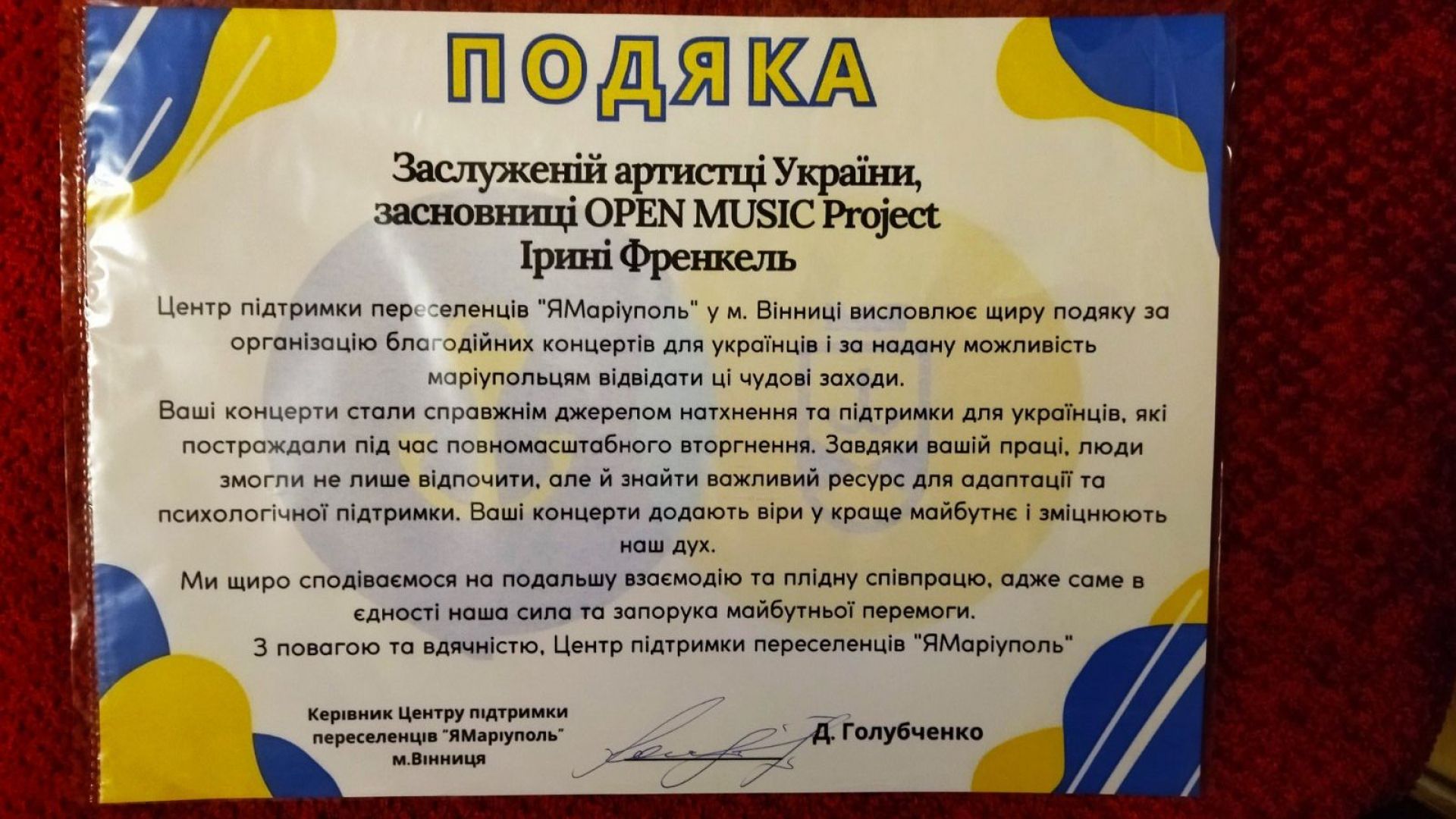 — З дня концерту у Вінниці я отримую багато дзвінків зі словами вдячності за цю подію, — ділиться засновниця проєкту, керівниця міжнародної концертної агенції OPEN MUSIC PROJECT, заслужена артистка України Ірина Френкель. — Я в свою чергу хочу висловити слова вдячності диригенту Володимиру Сивохіпу за те, що українська музика лунає у світі та в Україні. Дякую Академічному симфонічну оркестру Львівської національної філармонії та піаністці Віоліні Петриченко за її прагнення і реальну популяризацію української музики за кордоном та чудове виконання фортепіанного концерту Віктора Косенко у Вінниці. Сподіваюся почути його наживо. Я від щирого серця дякую Наталі Некипілій за згоду стати голосом українських жінок в цьому концерті. Я розумію, наскільки важко їй було читати листи, тому що вона пережила особисту трагічну втрату в цій війні. Захоплююсь її мужністю і жіночістю. Слава українським жінкам у її особі. Моя подяка всім, хто підтримав цей проєкт, і нашим шановним глядачам. Glory to Ukraine!