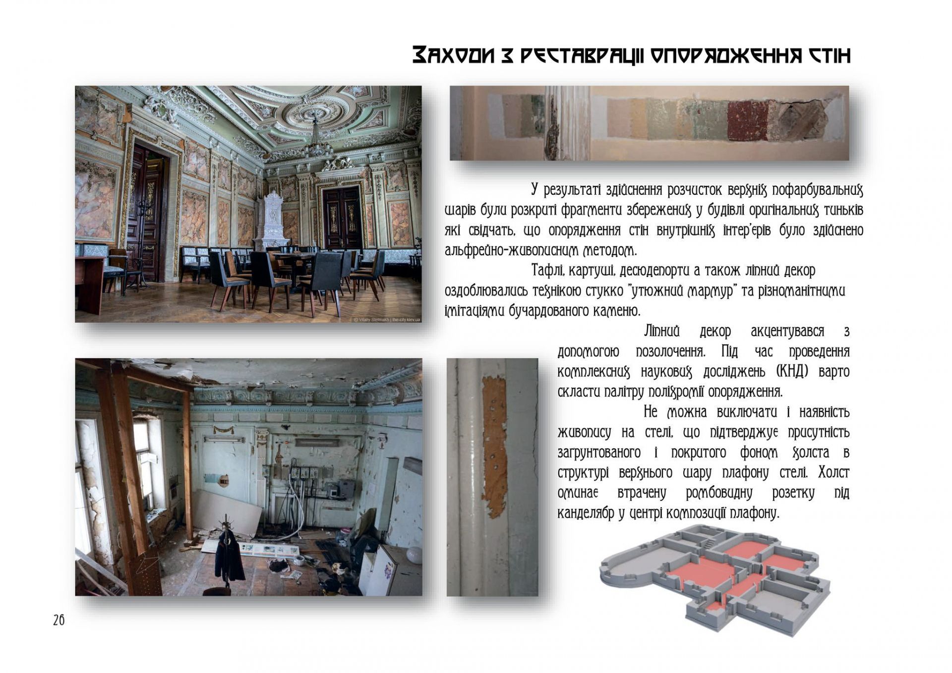 Реставраційні заходи всередині будівлі серед іншого передбачають відновлення оригінальних дверей, відтворення втрачених кахельних печей, опорядження стін та багато іншого.