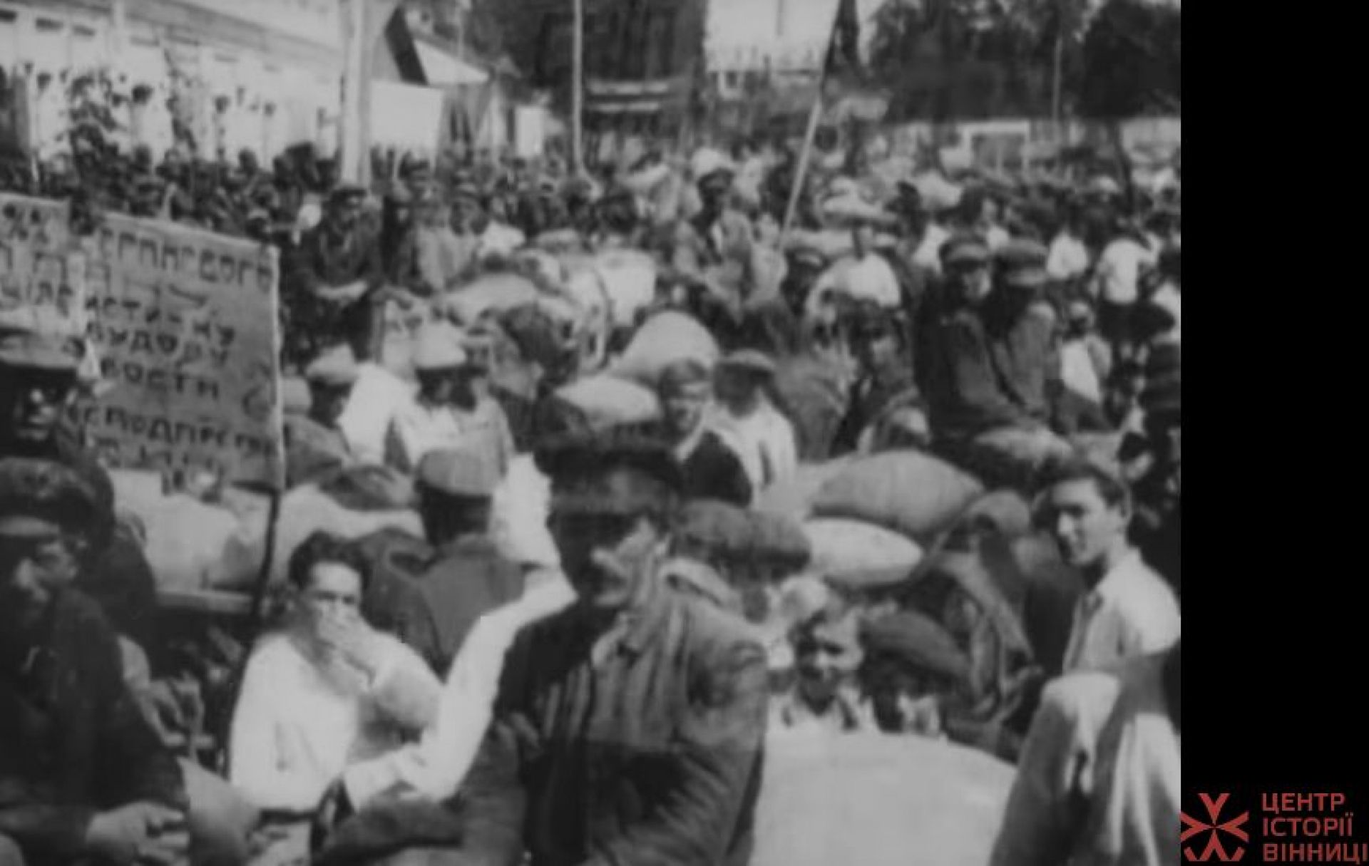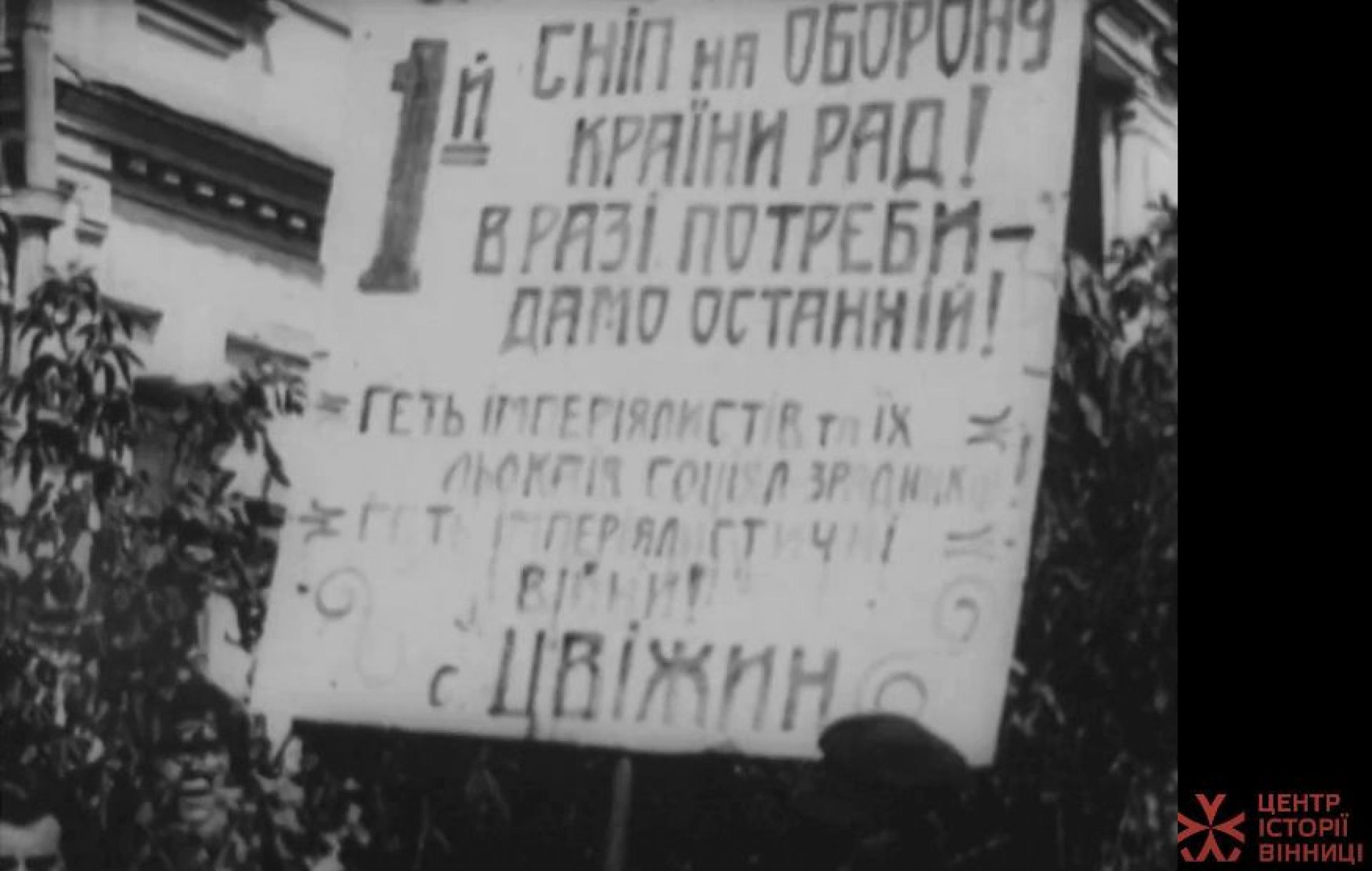 — Делегація, яка рухалась із П’ятничан, ймовірно, до середмістя Вінниці, прибула до місця свого призначення та взяла участь у мітингу. У кадрах видно транспарант, на якому написано: «1-й сніп на оборону країни Рад! В разі потреби — дамо останній! Геть імперіалістів» — підписалися мешканці села Цвіжин (Вінницький район, Вінницької області), — уточнює Олеся Коваль.