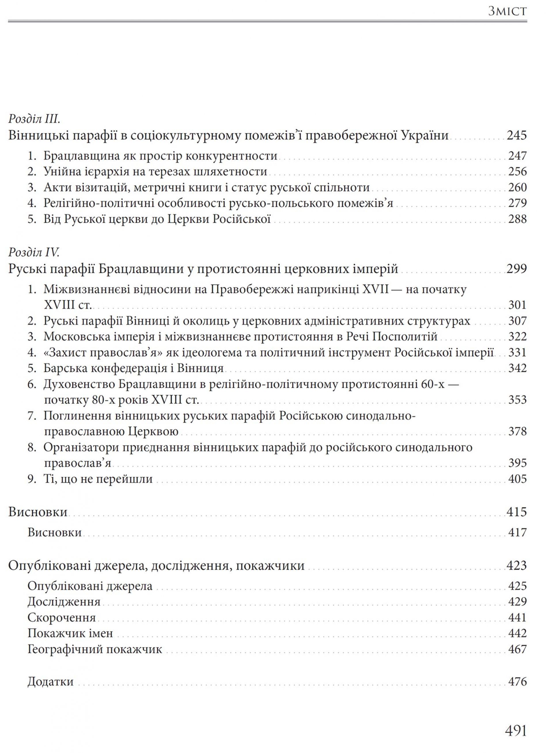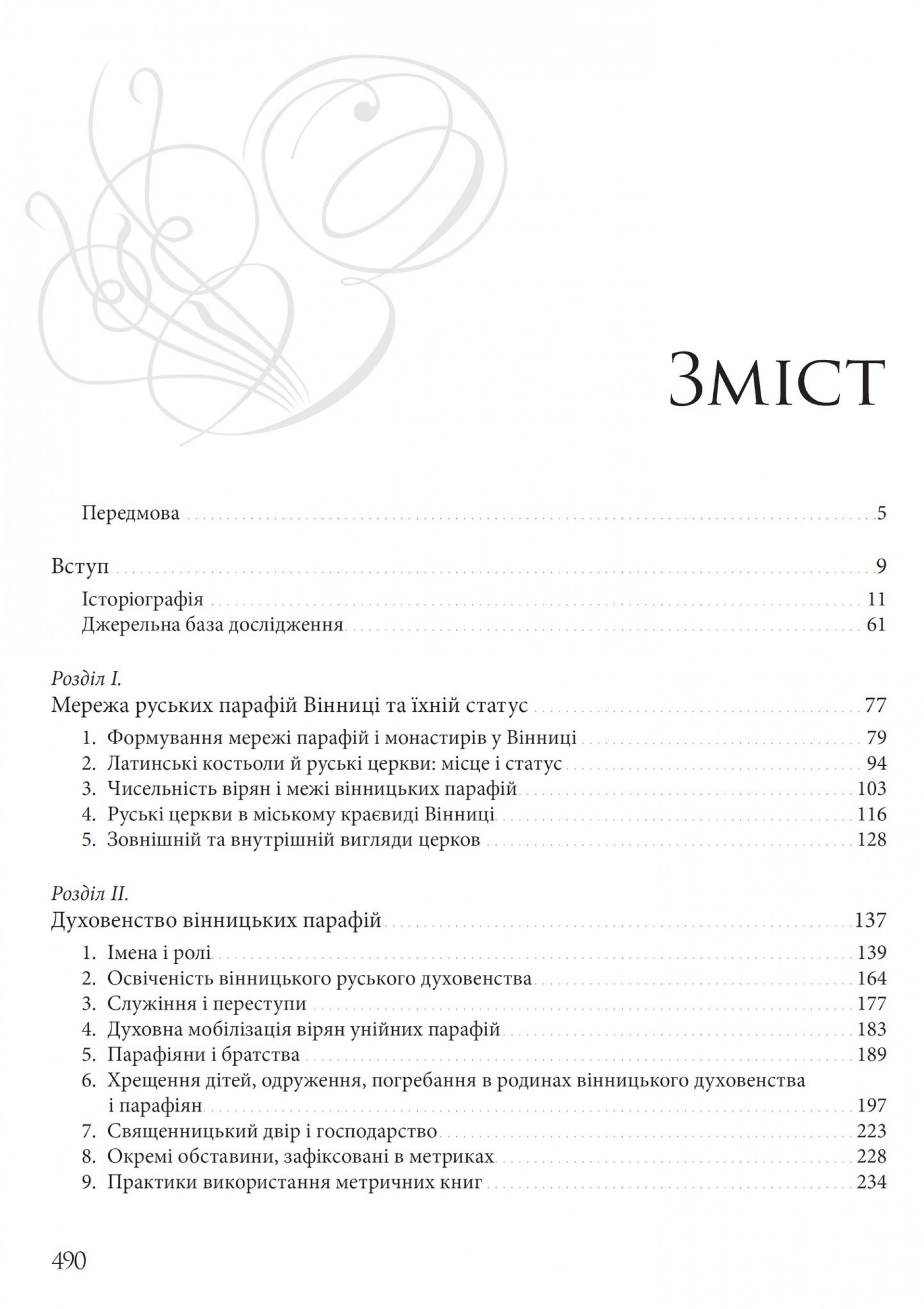 Багато уваги автор приділив духовенству вінницьких парафій того часу. До прикладу, в монографії можна знайти інформацію про освіченість вінницького руського духовенства, духовну мобілізацію вірян унійних парафій , особливості хрещення дітей, одруження та погребання у родинах вінницького духовенства й парафіян.