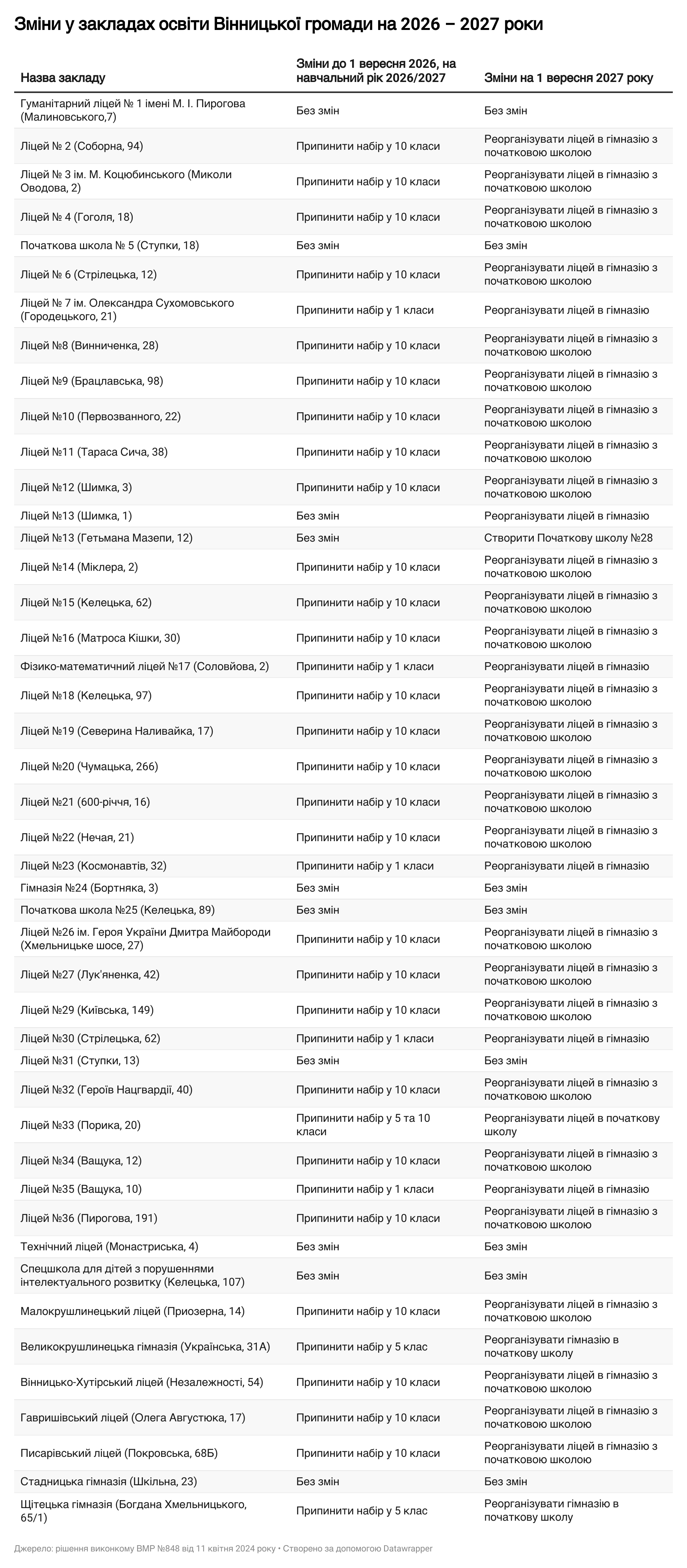 Крім того, з нового навчального року 2026/2027 не будуть набирати як до 10 класів, так і до 5 класів у вінницькому ліцеї №33. Ще припинять набір до 5 класів у Великокрушлинецькій гімназії та до Щітецької гімназії.