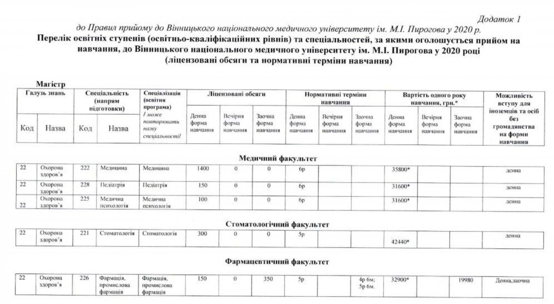 Вартість року навчання для студентів, які вступають на повний період навчання у Вінницький національний медичний університет ім. М. І. Пирогова цьогоріч складає від 31 600 до 42 400 гривень.