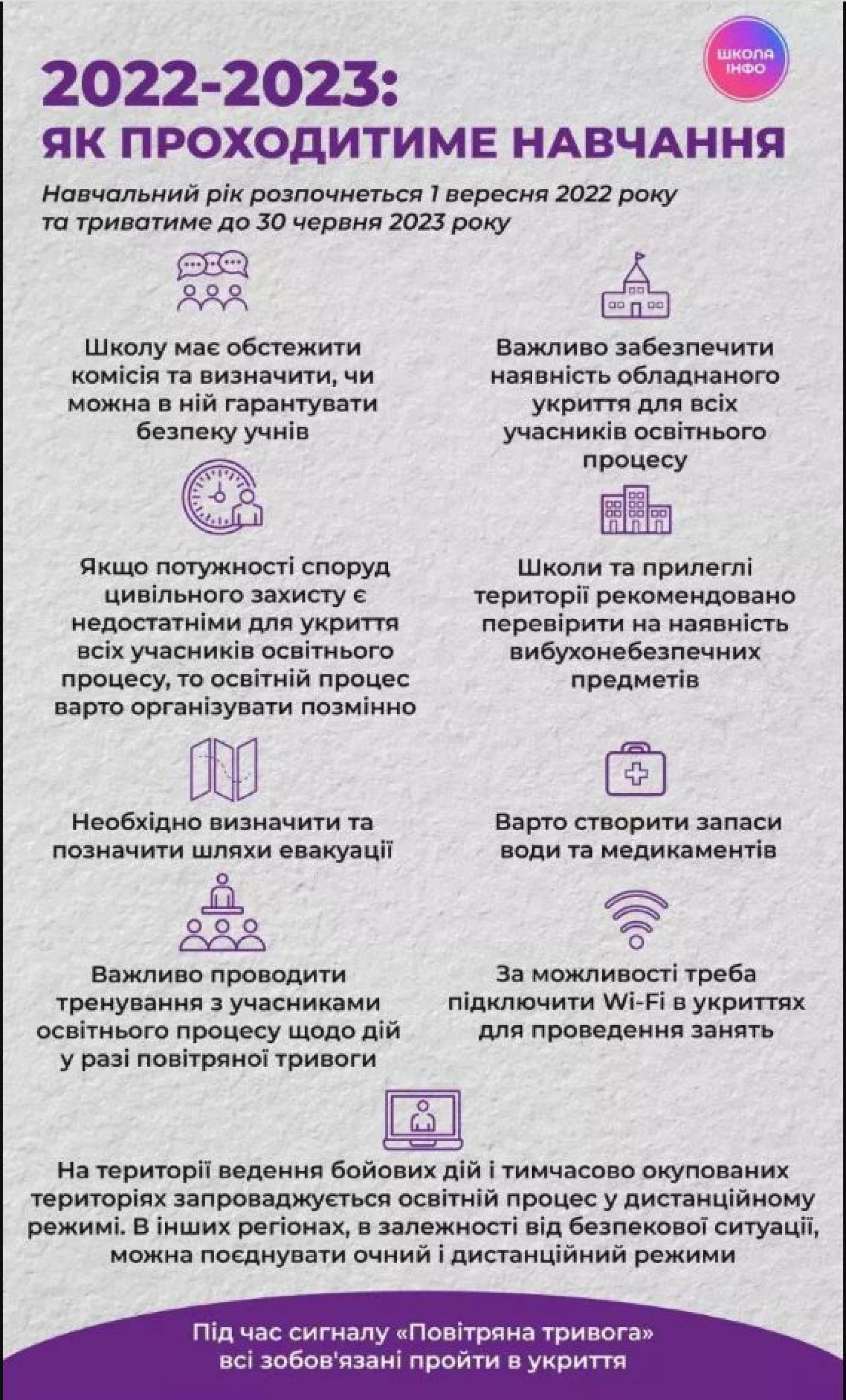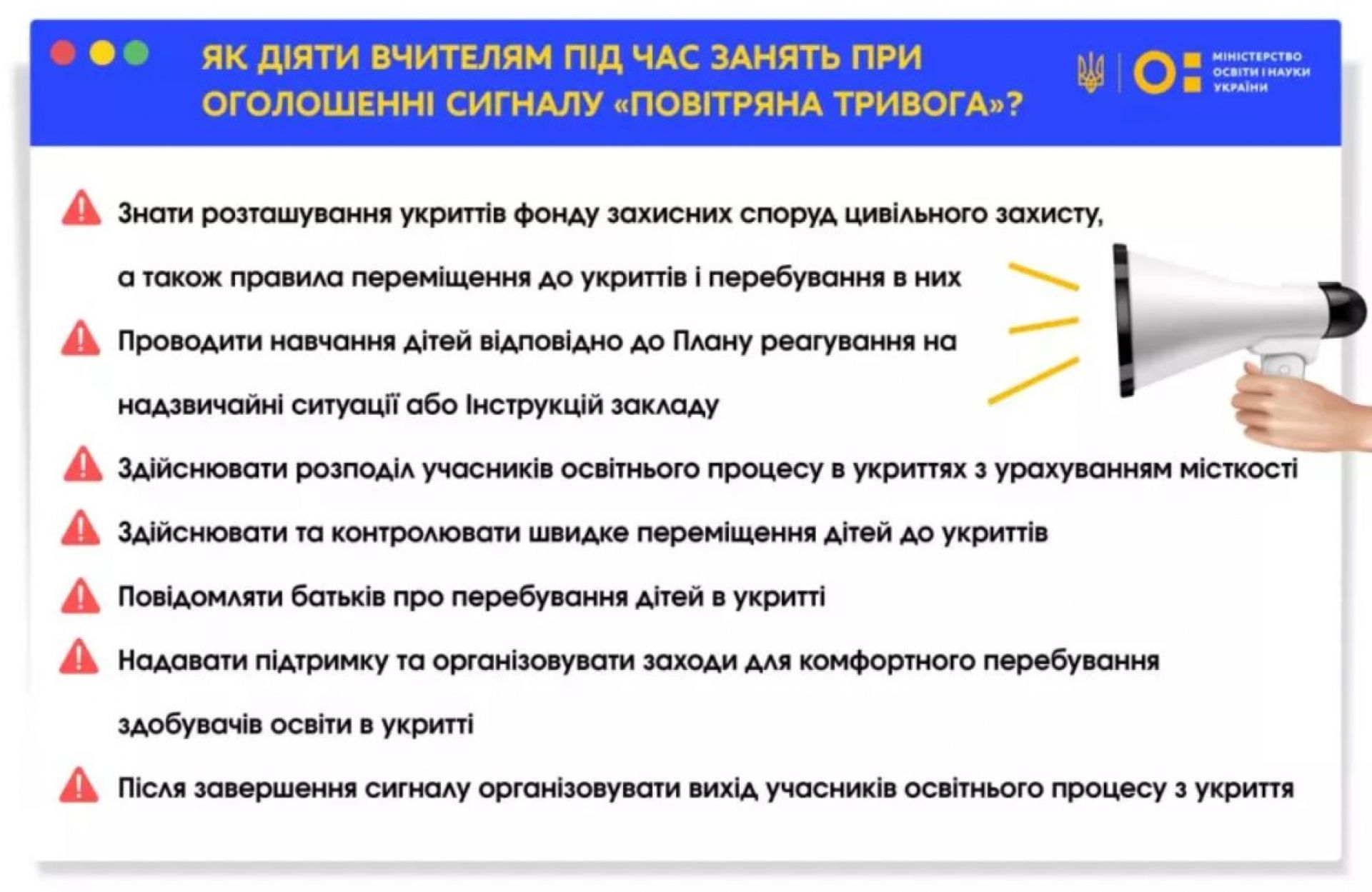 МОН підготувало алгоритм дій для вчителів у разі проведення занять і увімкнення сигналів тривоги, що розроблений на основі рекомендацій ДСНС України.