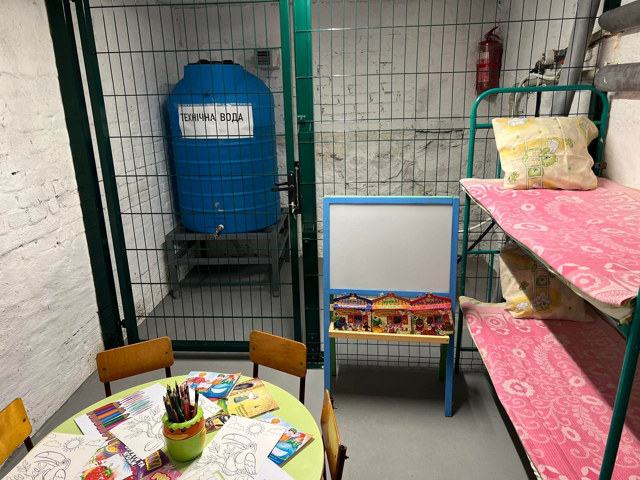 — Найпростіше укриття має резервне освітлення, запаси питної води та їжі, вогнегасники, ігровий простір, ліжка та туалет, — розповідає Наталія Поплавська. — Також діти в укритті не тільки перечікують повітряну небезпеку, а ще й продовжують заняття згідно до плану.