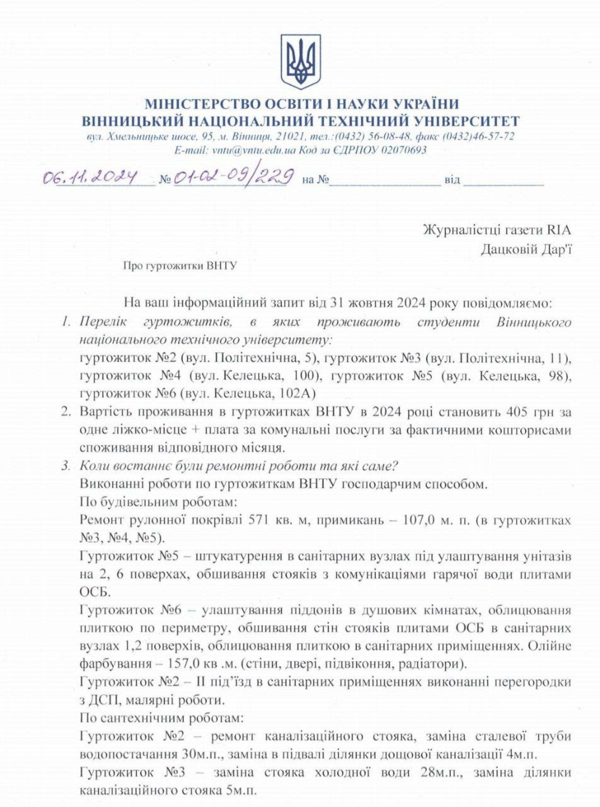 У ВНТУ є п’ять гуртожитків, у яких проживають студенти. Університет повідомив, що в гуртожитках проводяться планові ремонти господарським способом. Зокрема: